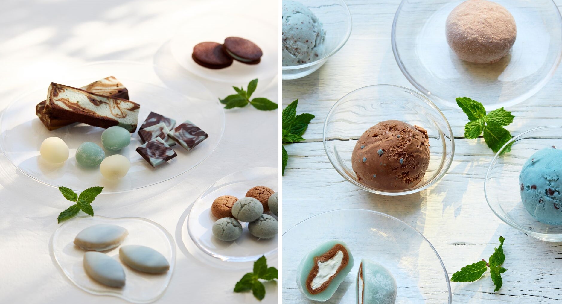 昨年もご好評いただいた「素材を生かしたアイス チョコミント」、「素材を生かしたアイス チョコミント クール」に加え、今年はミントが香るビターなチョコレートアイスにミント風味のキャンデーを入れた「素材を生かしたアイス チョコミント チョコレート」を新たに発売します。また、チョコチップ入りのミントクリームの大福と、チョコレート餡とミントクリームを包んだ大福の2種を詰め合わせたさわやかな香りとやさしい甘みが特長の「チョコミントのクリーム大福アソート」を発売します。