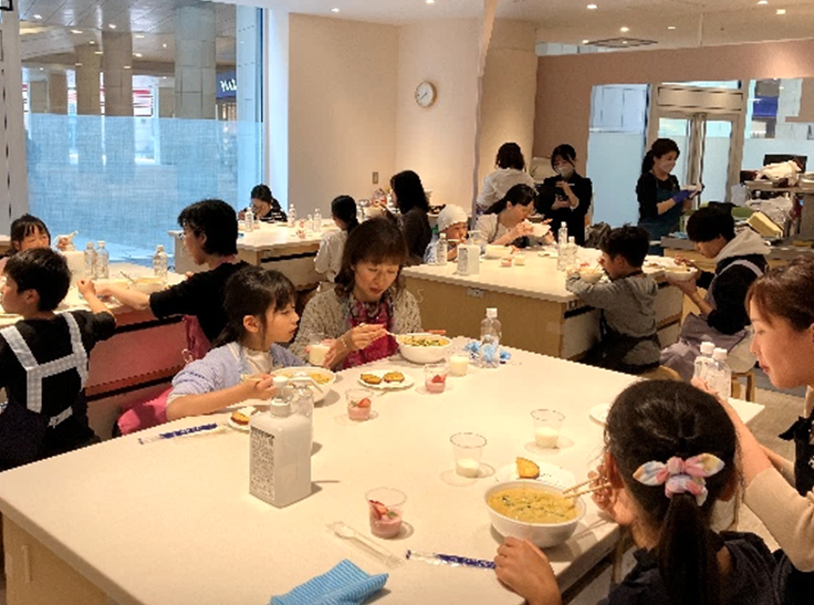 子どもたちは、牛乳を計量カップで慎重に量ったり、鍋の中のうどんを混ぜたりと、真剣な表情で調理に取り組んでいました。保護者と協力しながら声を掛け合う場面も見られ、会場は終始和やかな雰囲気に包まれていました。