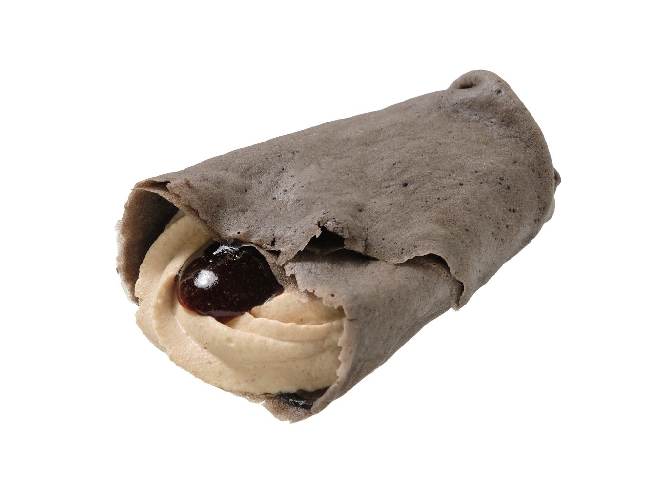 もちもち食感のクレープ生地とお餅を組み合わせた、もっちり食感を存分に楽しめるクレープ。クレープ生地に、きなこクリームを絞り、おもち、アクセントに黒蜜ソースを入れて包んだ「和」を感じられる仕立てです。