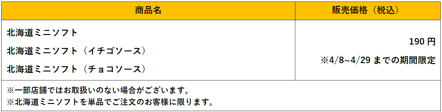 株式会社アレフ(本社:北海道札幌市、代表取締役社長:庄司 大)が展開するハンバーグレストラン「びっくりドンキー」は、4月8日(水)〜4月29日(水)の期間限定で、通常価格290円(税込)の「北海道ミニソフト」「北海道ミニソフト(イチゴソース)」「北海道ミニソフト(チョコソース)」を190円(税込)で販売します。
