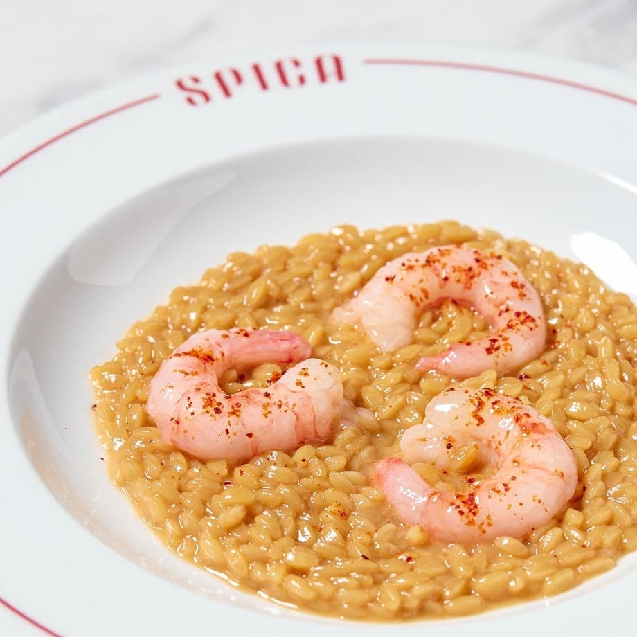 SNS総フォロワー約220万人の「George(ジョージ)」として知られる吉田能(George)シェフがメニュー監修を務める、表参道のイタリアンダイニング<スピカ>。フレンチの技を生かし、イタリアンを基軸にジャンルレスな料理を提案。シグネチャーの甲殻の殻でとった濃厚な出汁で炊く“〆の濃厚ビスクのリゾット”を、オマール海老と米粒形パスタで再構築した贅沢な一皿です。