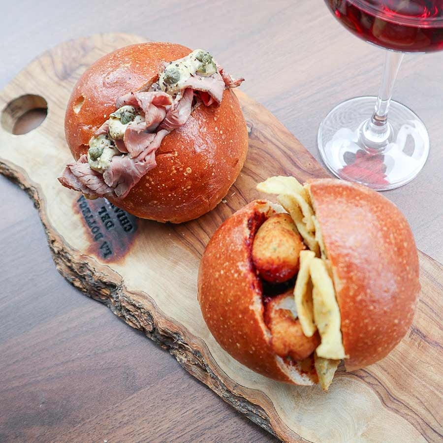 アリメンターリは食材屋さんという意味。日本の角打ちスタイルで、気軽にお酒とイタリア惣菜が楽しめるお店。牛ギアラの煮込みをロゼッタパンで挟み、サルサヴェルデ、サルサピッカンテを添えたひと品はフィレンツェのストリートフード。赤ワインとも好相性です。