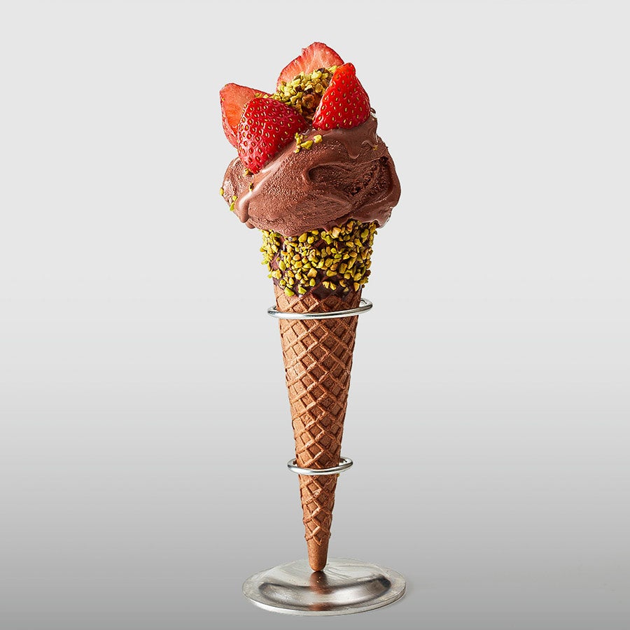 濃厚なチョコレートのジェラートに、甘酸っぱい苺と香ばしいカダイフ、ピスタチオ、ウエハースを合わせた食感も楽しいソースをとろりとトッピング。