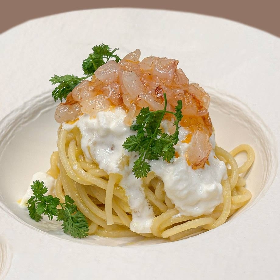 <パスタマードレ>黄色いトマトソースのスパゲッティ 生エビのタルタルとストラッチャテッラチーズ 地中海の香り 3,520円 ※各日70点限り