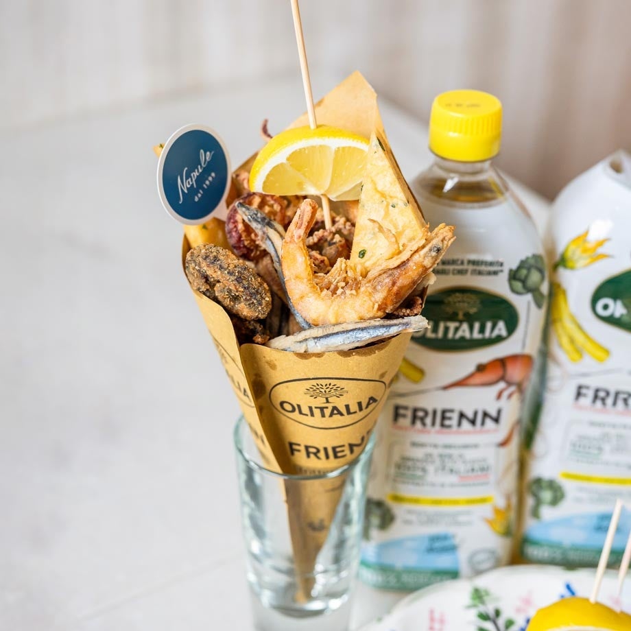 「南イタリアのローカルフードの素晴らしさと楽しさを、焼きたてのナポリピッツァと共に現地の味をそのままに」をモットーに。開業から31年、シンプルだからこそ素材選びにこだわり、美味しさと健康を届けています。今回は、イタリアの港町や街角で親しまれるストリートフードを再現。ローズマリーを配合したひまわりオイル「フリエン油」で魚介の旨みを閉じ込め、外は軽やかに、中は驚くほどジューシーに仕上げました。熱々のうちにレモンを軽く絞れば、爽やかな香りとともに南イタリアの味わいが広がります。