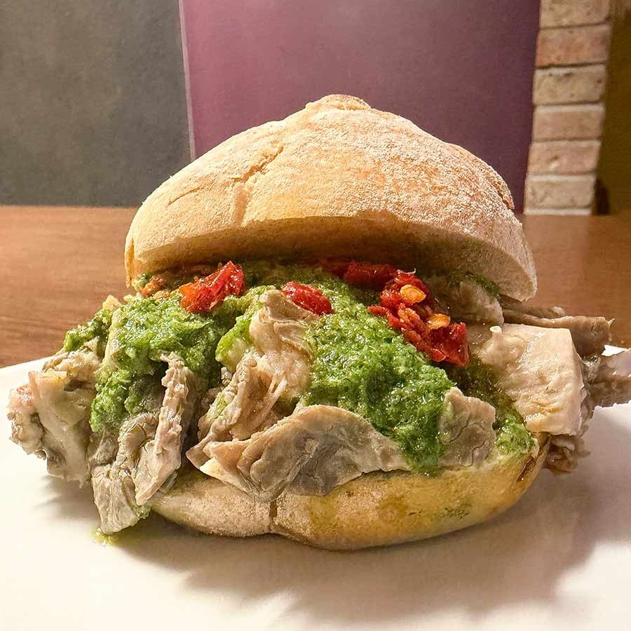 アリメンターリは食材屋さんという意味。日本の角打ちスタイルで、気軽にお酒とイタリア惣菜が楽しめるお店。牛ギアラの煮込みをロゼッタパンで挟み、サルサヴェルデ、サルサピッカンテを添えたひと品はフィレンツェのストリートフード。赤ワインとも好相性です。