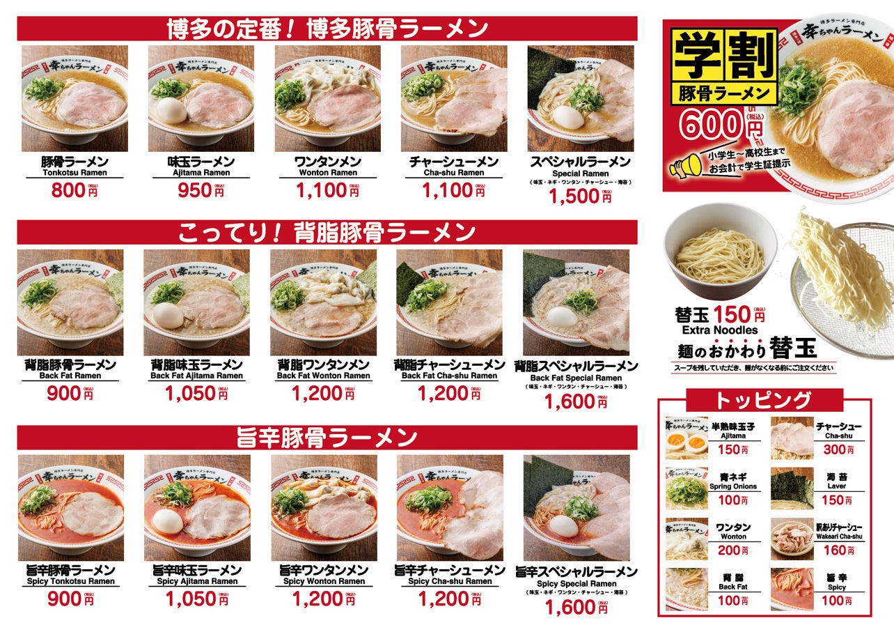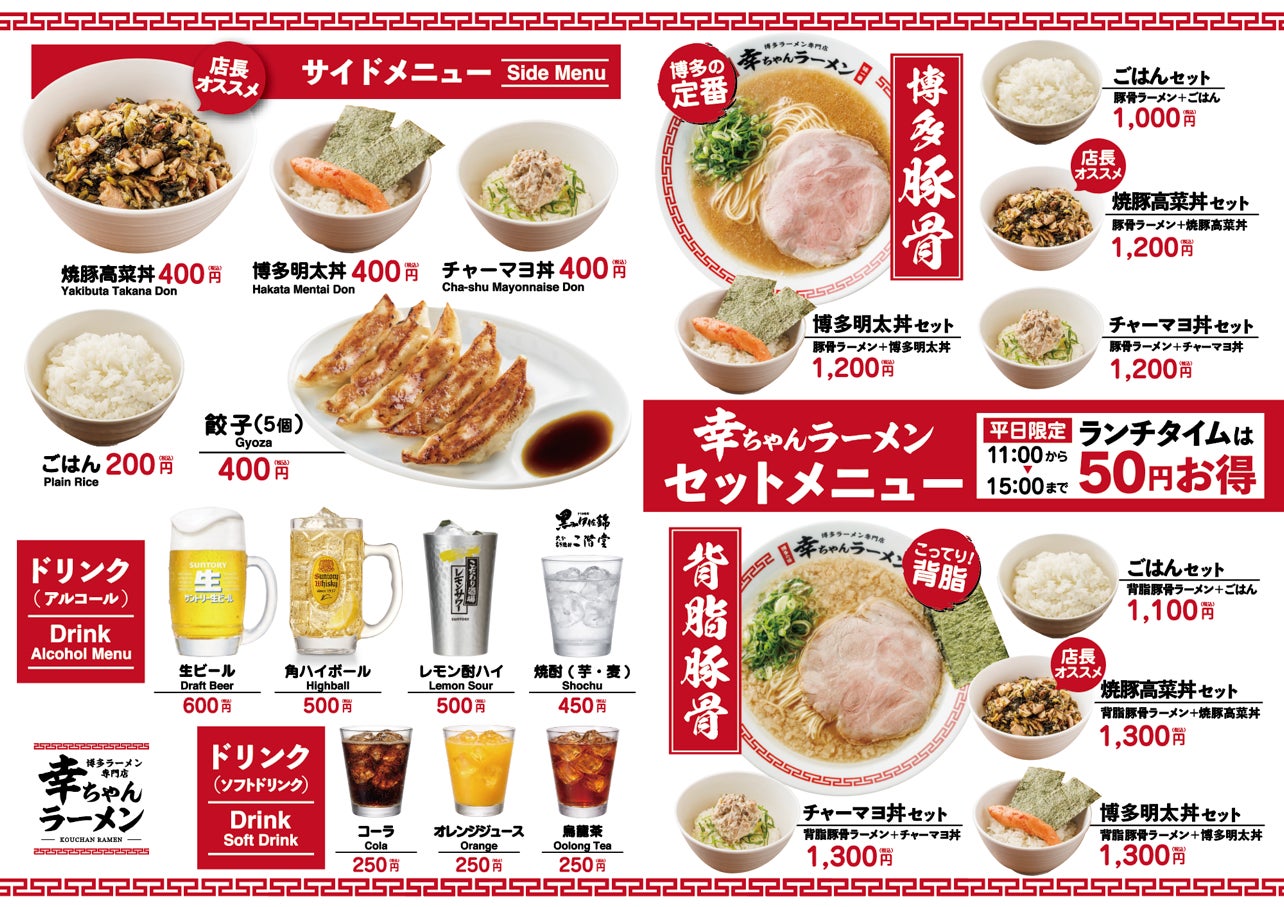 博多ラーメン専⾨店 幸ちゃんラーメン(こうちゃん)は、本場博多はもとより国内外10カ国で愛されている元祖泡系豚⾻ラーメン『博多⼀幸舎』がプロデュースする、豚⾻ラーメンブランドです。2026年4⽉現在、国内に19店舗、海外2店舗を展開し、看板商品の「博多豚⾻ラーメン」は、試⾏錯誤の後、しっかりと豚⾻の旨味(パンチ)と、ほんのり感じる⽢みがクセになるスープが特徴の豚⾻ラーメンとして完成しました。そして、麺は幸ちゃんラーメンの為だけに特別配合したこだわりの⼩⻨粉を使用。幸ちゃんラーメンオリジナルの豚⾻スープに合うよう、特注の細麺を使⽤しています。⼩⻨本来の⾹りが豊かに広がり、もっちり感と、しなやかなコシを楽しめ、パツッとした⾷感がついつい替⽟を注⽂したくなるほどクセになります。こだわりの、しっとりとした特製⼤判チャーシュー、シャキシャキの⻘ネギと⾷べ進めていただくことで、本場博多の町豚⾻を感じていただけます。そんな幸ちゃんラーメンは、お⼦様からご年配の⽅、⽼若男⼥問わず幅広い⽅達より「早い、美味い、また来たい!」本場博多の町豚⾻として⽀持いただいています。