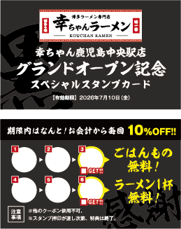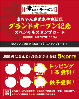 「幸ちゃんラーメン 鹿児島中央駅店」のオープンを記念し、先着3,000名様限定で、使えば使うほどお得になる「グランドオープン記念スペシャルスタンプ(赤)カード」を配布いたします。
