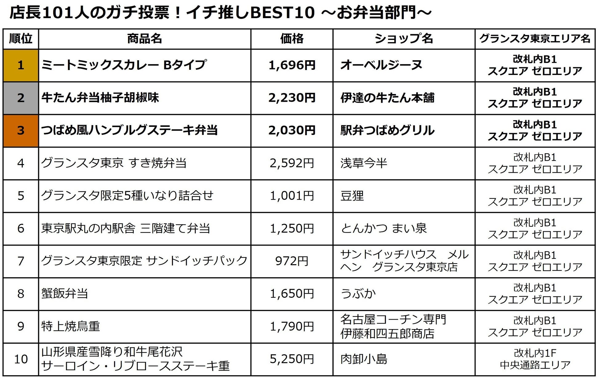 今回の投票に参加したのは、JR東京駅で多くのお客さまをお迎えし、自らもグランスタ東京の味や魅力に触れている、グランスタ東京・グランスタ丸の内各ショップの店長たちです。お弁当ショップだけでなく、スイーツ・雑貨と多岐にわたるジャンルの店長101人による投票で、リアルな視点で選んだ「推し弁当ランキング」を発表します。芸能人にもファンの多いカレーの名店や、仙台発祥の肉厚な牛たん、店内キッチンで挽き肉にするところから手作りするハンブルグステーキ、見た目もカラフルなサンドイッチなど、味も見た目も太鼓判!な東京駅限定弁当を、ランキング形式でご紹介します。