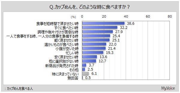 カップめんを食べる人が、どのような時にカップめんを食べるか聞いたところ(複数回答)、「食事を短時間で済ませたい時」が38.6%、「すぐに食べたい時」が32.2%、「調理や後片付けが面倒な時」が27.9%です。