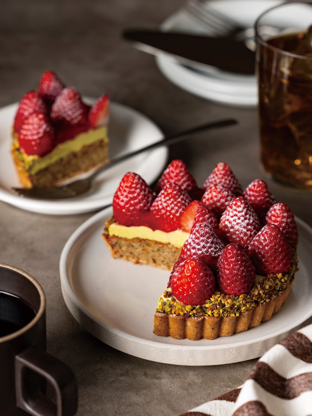 たっぷりのいちごに、濃厚なピスタチオカスタードクリームを合わせました。甘酸っぱいいちごのコンフィチュールを添えた、いちご好きにはたまらない一品です。
