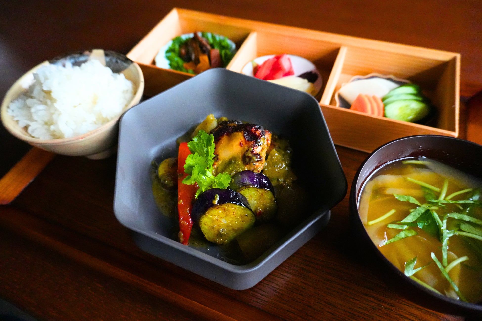 一般的なココナッツミルク主体のカレーとは異なり、和出汁をベースに、ライムリーフやシシトウ、唐辛子を配合。漬物由来の深いコクと乳酸発酵の酸味が、スパイスの角を丸め、奥深い味わいを生み出します。 -