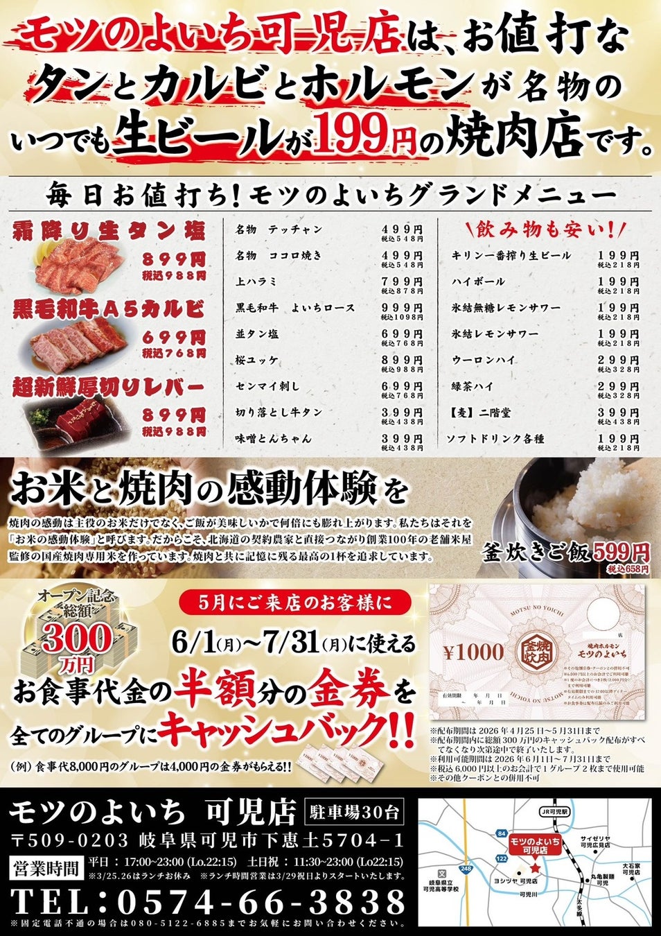 ・特典内容: 5月中にご来店のお客様へ、6月・7月で利用可能な**「お食事代金の半額分」の金券**をキャッシュバック!