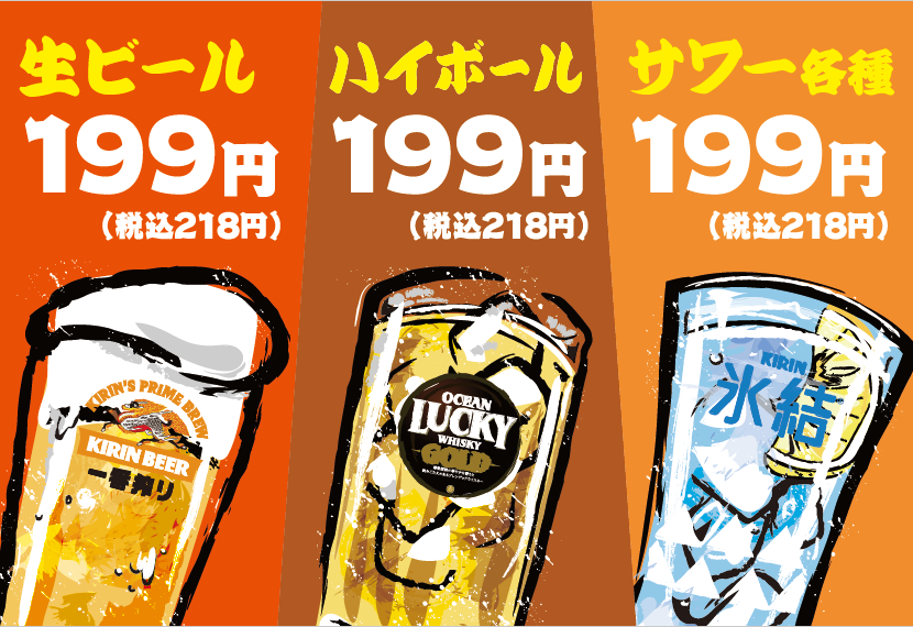 ■いつでも「生ビール・ハイボール・レモンサワー」が199円(税込218円)!