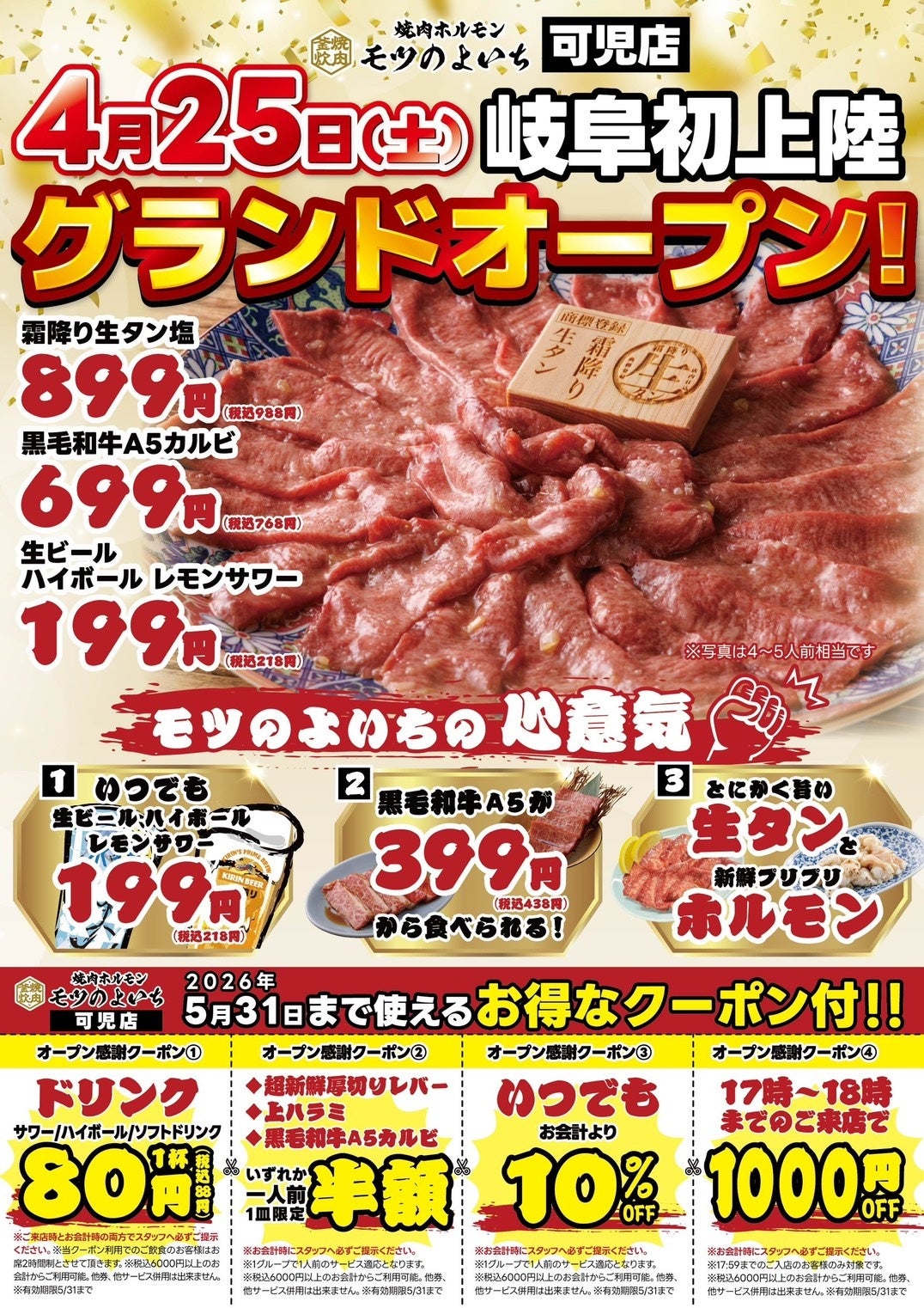 三重県を中心に展開し、連日行列の絶えない人気焼肉店「焼肉ホルモン モツのよいち」が、2026年4月25日(土)、ついに岐阜県へと初上陸いたします。可児市の新たな食の拠点として、最高品質の「商標登録 霜降り生タン」や「黒毛和牛A5カルビ」を、日常使いできる圧倒的な低価格でご提供いたします。