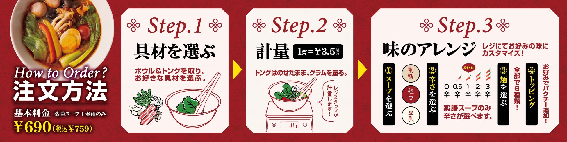 漢方やスパイスを煮込んだ特製の薬膳スープに、彩り豊かな野菜を好きなだけ!美味しく・楽しく・ヘルシー。なのにしっかり満腹になる!毎日でも飽きない「わたしだけの麻辣湯」が、きっと見つかる!