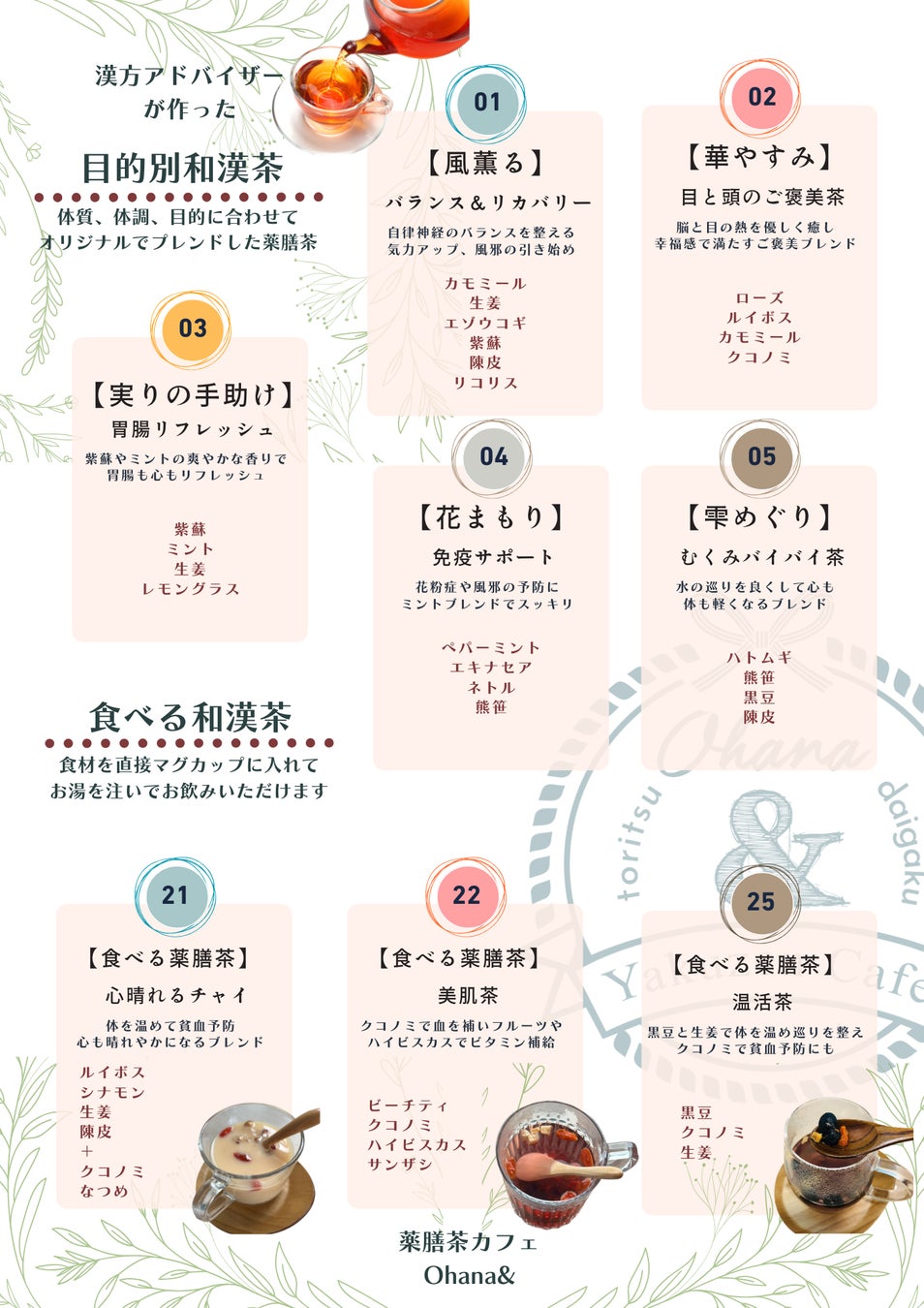 提供内容:薬膳茶、薬膳粥、オーダーメイド薬膳茶、足裏リーディング、アロマトリートメント、ハーブ蒸し ほか