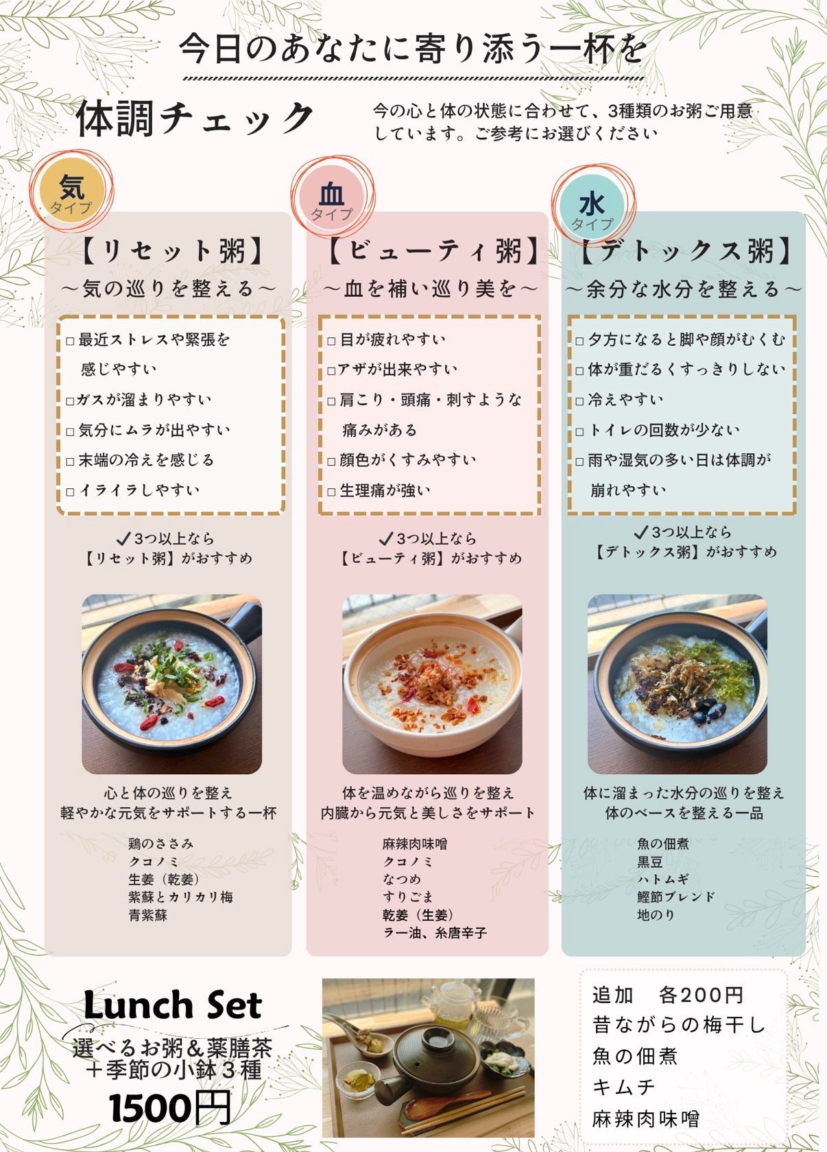 店内では、簡単な体調チェックを通して、今の自分に合った薬膳茶や薬膳粥を選ぶことができます。