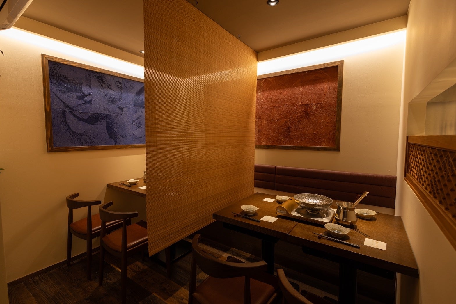 店内は大切な会食や特別な夜に大人の隠れ家として、会話も美食も堪能できる半個室をご用意。カウンター席では、料理人の手さばきを目の前で楽しめる贅沢な特等席となるように設計し、シェフとの距離が近くライブ感のある時間を楽しめます。