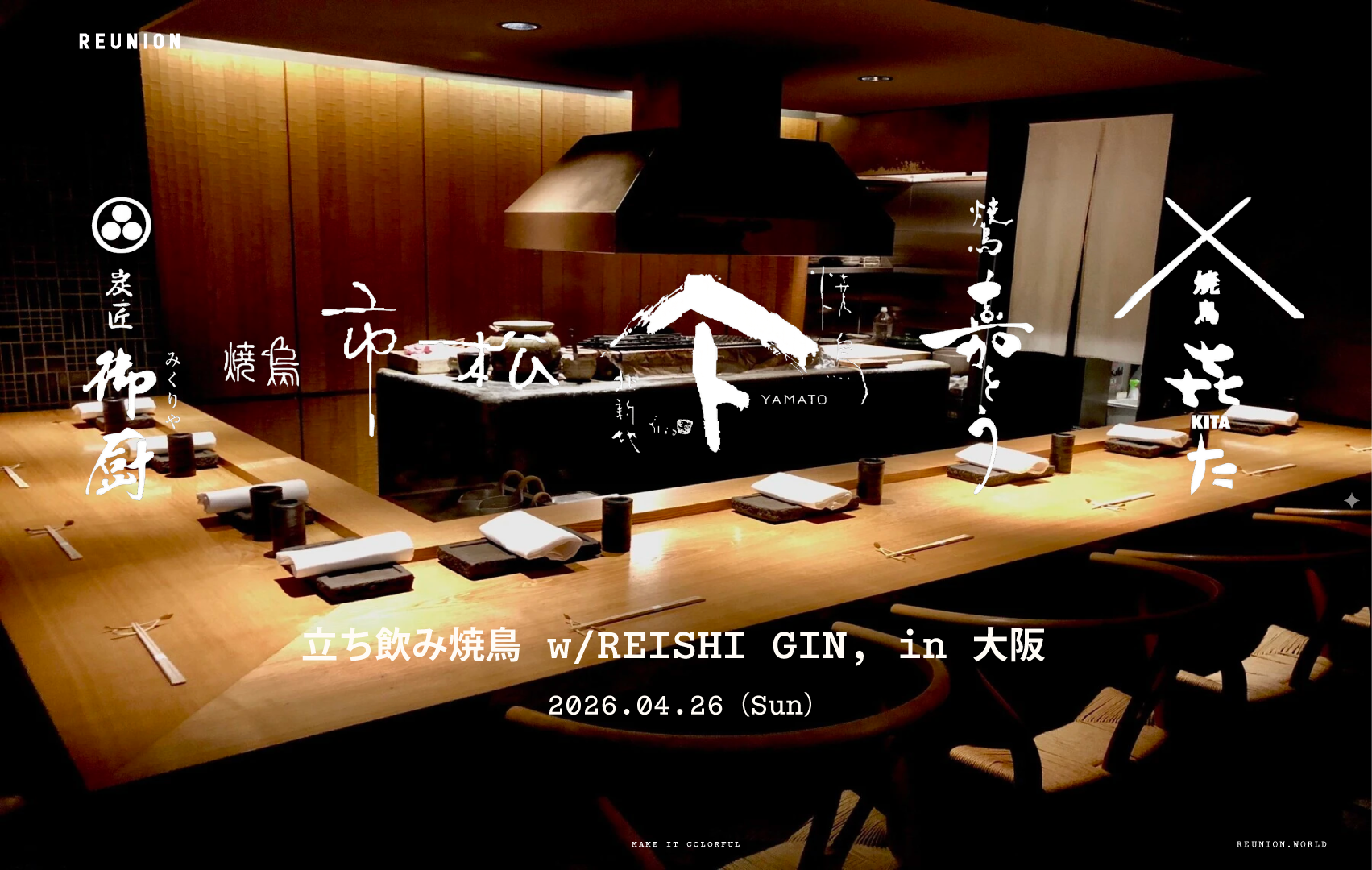 地球と人にやさしいウェルネスブランドREUNION(株式会社WWWE、東京都渋谷区)が展開する食中酒のニュースタンダード「REISHI GIN,」は、2026年4月22日(水)のアースデイ(地球の日)に3周年を迎えます。4年目となる今年は、昨年多くの来場者を集めた、名店の焼鳥を一度にカジュアルに楽しめる立ち飲みスタイルのPOPUPイベント「立ち飲み焼鳥 w/REISHI GIN,」を全国へ展開。全国各地を代表する焼鳥店とともに、地域ごとの焼鳥の魅力を発信しながら、珠玉の焼鳥とREISHI GIN,のペアリングを堪能できる唯一無二の焼鳥体験を提供します。今年最初の開催となる第三弾は、2026年4月26日(日)に関西初となる大阪での開催が決定。大阪の炭匠 御厨、焼鳥 市松、焼鳥YAMATOに加え、東京から焼鳥 嘉とう、焼鳥 㐂た(KITA)が参加し、ミシュランガイド掲載店を含む名店5店舗が集結します。