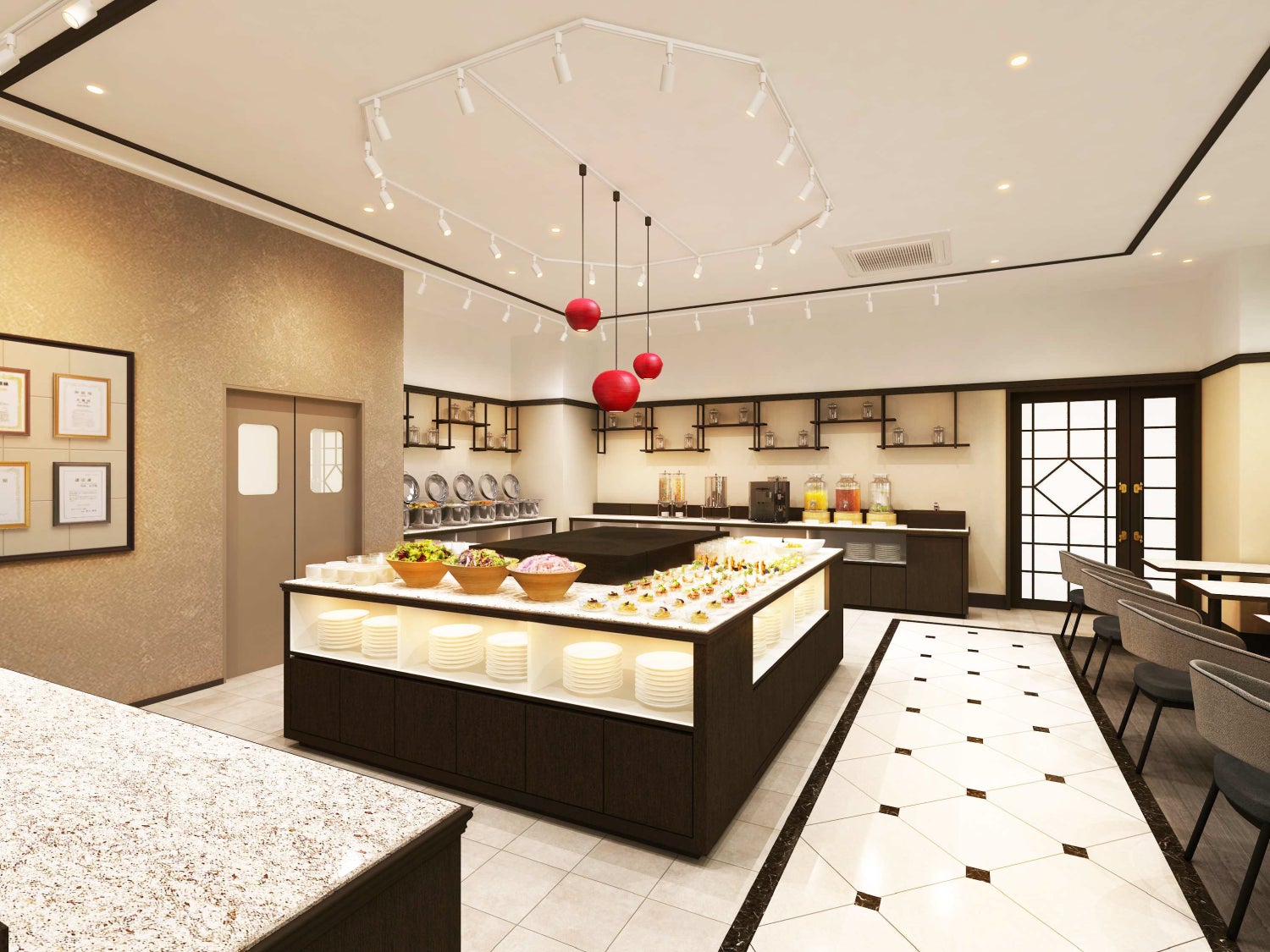 ブッフェエリアを拡張し、席数を増設する一方で、ゆったりと召し上がれるよう配置や動線にも配慮した快適な空間を実現いたしました。青森県産ブナ材を使用した木工品「BUNACO」のペンダントランプや、津軽びいどろの花瓶を取り入れ、青森の文化を感じられる演出も行っています。