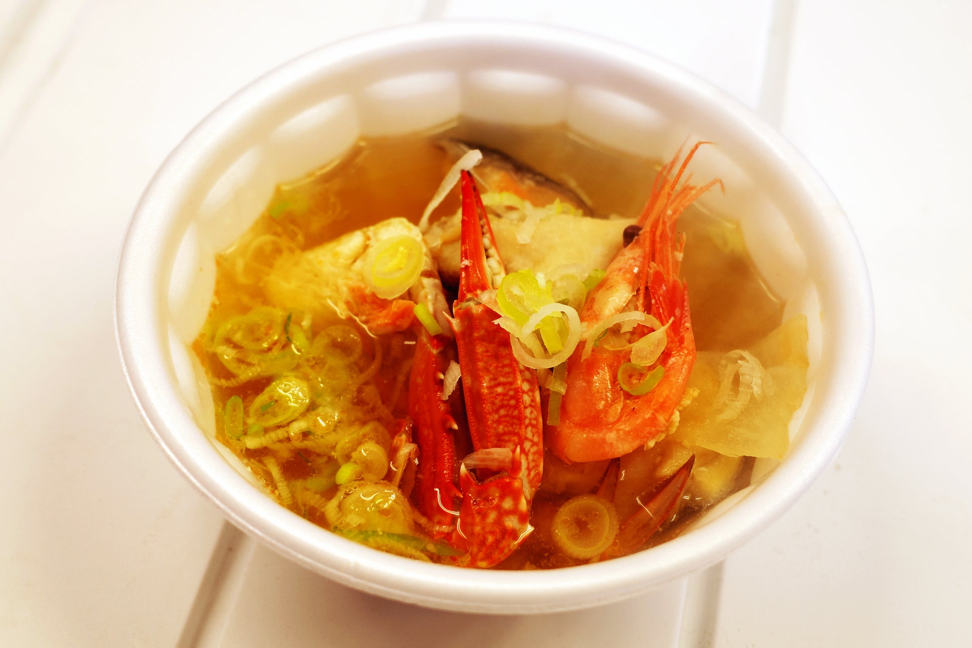 漁師たちが海辺で作業や寝泊まりをした「番屋」で食べていたという番屋汁を、角上魚類がアップデートした一杯。えび、かに、鮭やタラなどたっぷりの海鮮が入った、濃厚な旨みたっぷりの味噌仕立てスープです。