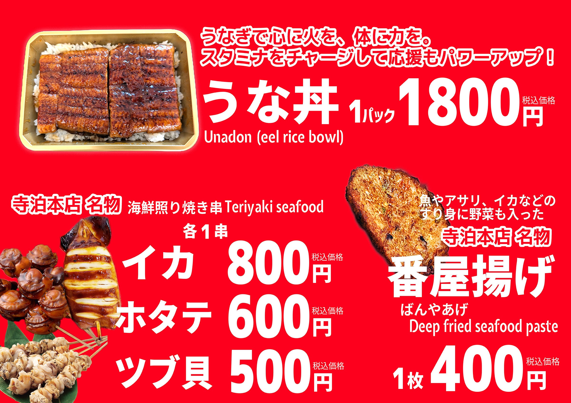 四色丼や番屋汁だけでなく、スタジアムの熱気に負けない食欲をそそるメニューが勢揃い!ビールやドリンクのお供としてワンハンドでかぶりつける熱々の串焼きや、ガッツリお腹を満たして全力応援に備えるお弁当など、その時の気分やお腹の空き具合に合わせて選べる、バラエティ豊かな勝負メシでお待ちしております。