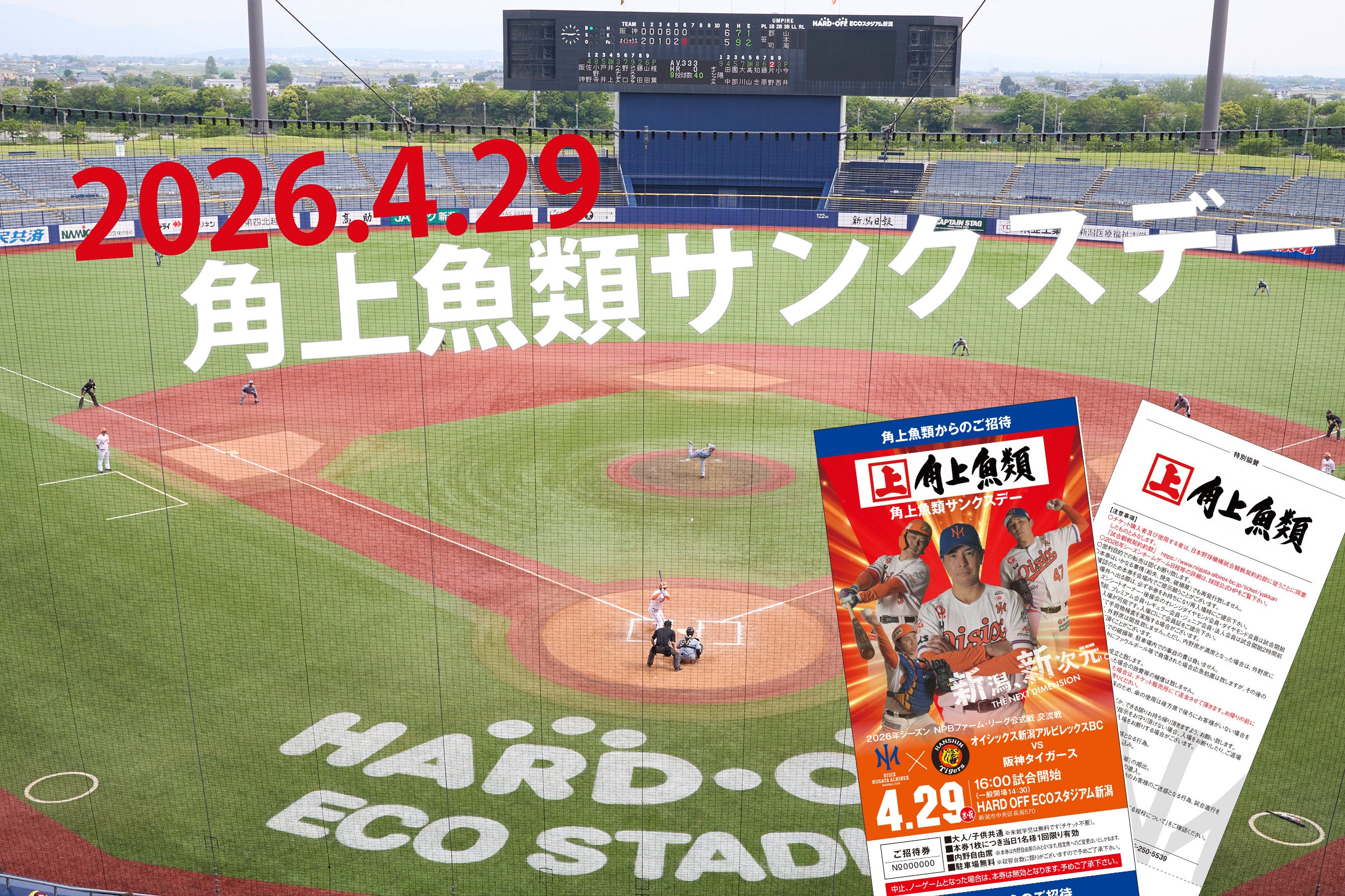 2026年4月29日(水・祝)に「角上魚類サンクスデー」を開催いたします。対戦相手に阪神タイガースを迎える本試合では、日頃のご愛顧と地域への感謝を込め、寺泊本店限定の『四色丼』や名物『番屋汁』など、本気の海鮮スタジアムグルメをご用意し、球場を熱く盛り上げます。