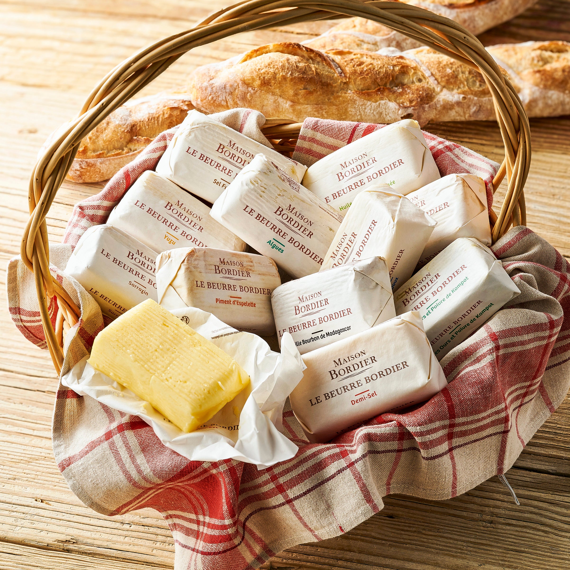フランス・ブルターニュ地方産の牛乳を使用し、手作業で丁寧に練り合わせ成形される<BORDIER/ボルディエ>のバターは、濃厚で味わい深く、個性的なフレーバーが魅力。三ツ星レストランや一流ホテルでも愛用され、有塩・食塩不使用はもちろん、海藻の香りを感じるバター、玉ねぎの甘みと塩気が調和したバター、葉にんにくが香る有塩バターなど多彩なラインナップ。豊かな香りと滑らかな口溶けで、料理を格上げします。お気に入りの味がきっと見つかります。