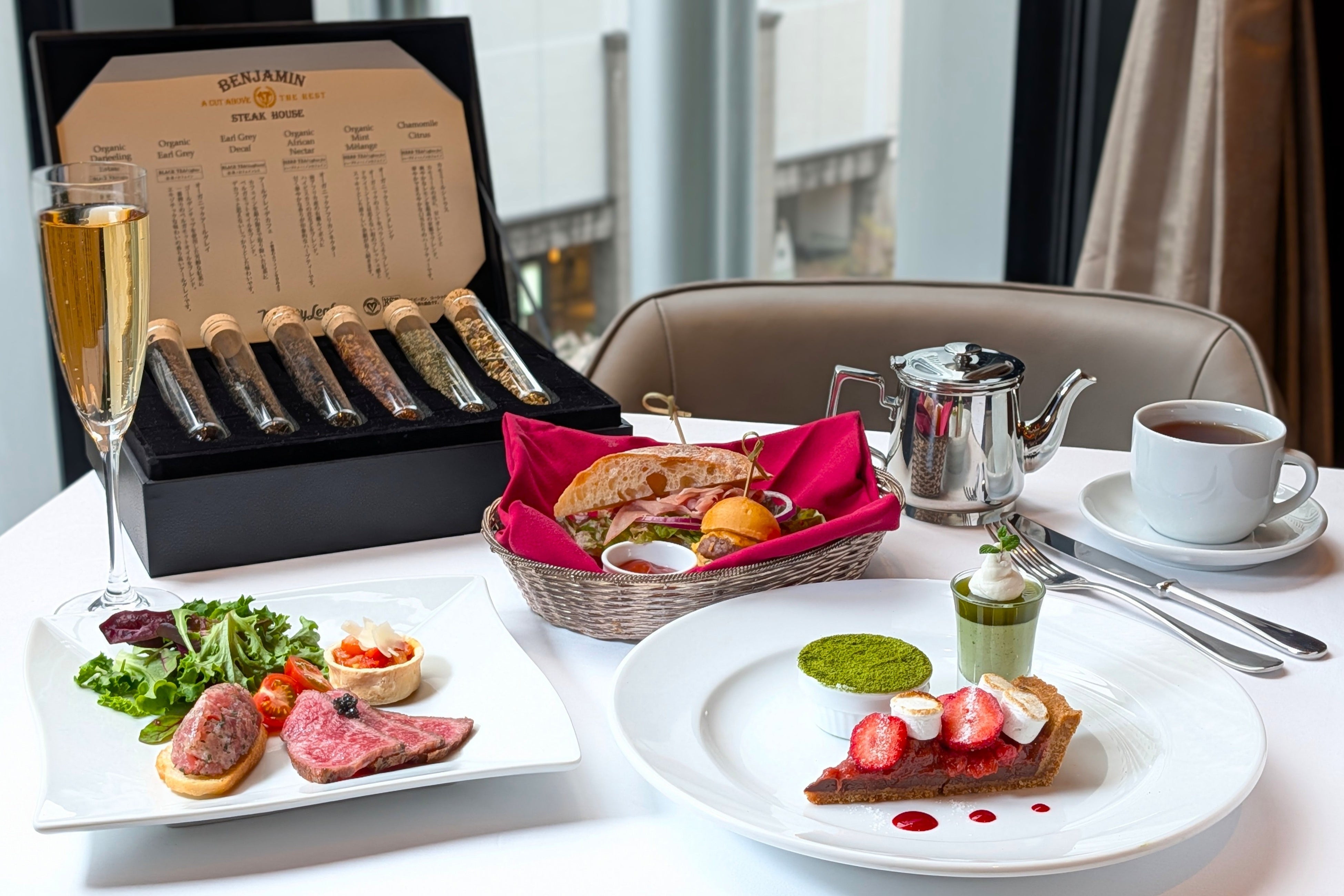本アフタヌーンティーは、NYスタイル×日本の季節美をイメージし、ベンジャミンステーキハウスらしい軽食・肉料理・デザートをバランスよく構成しました。