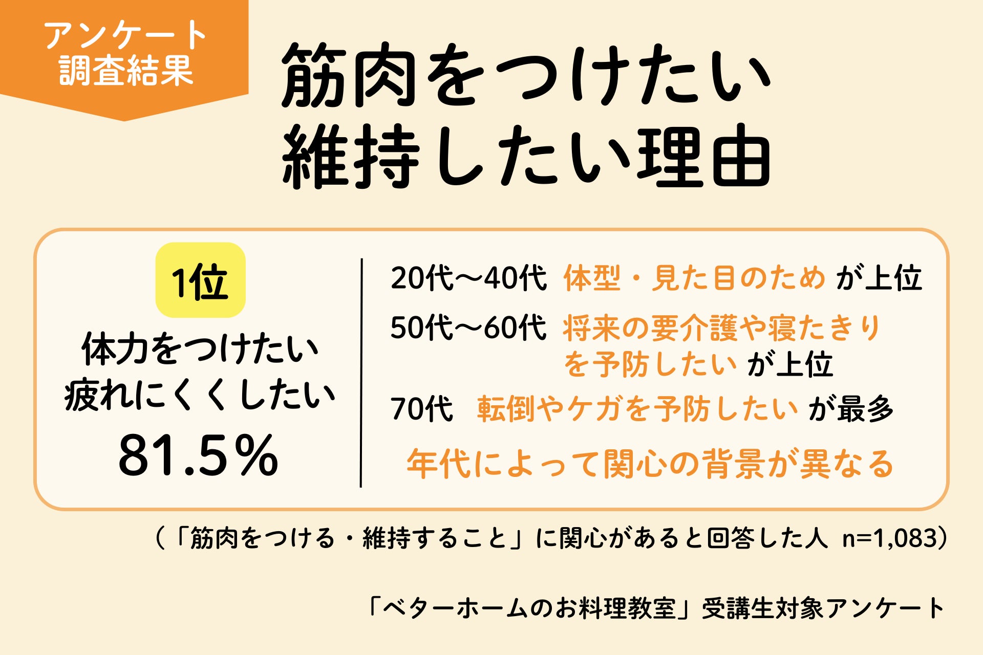 全国で料理教室を展開する一般財団法人ベターホーム協会(本部所在地:東京都渋谷区、理事長:大塚義幸、以下「ベターホーム」)は、「ベターホームのお料理教室」の受講生1,124人を対象に「筋活と食についての意識調査」を実施しました。