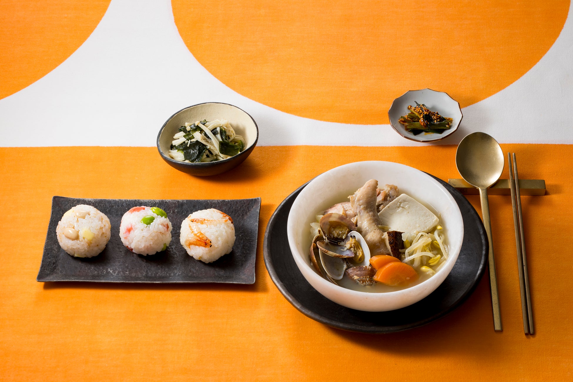 白いスンドゥブ/育筋ボールおにぎり3種/えのきとわかめのうま塩ナムル -