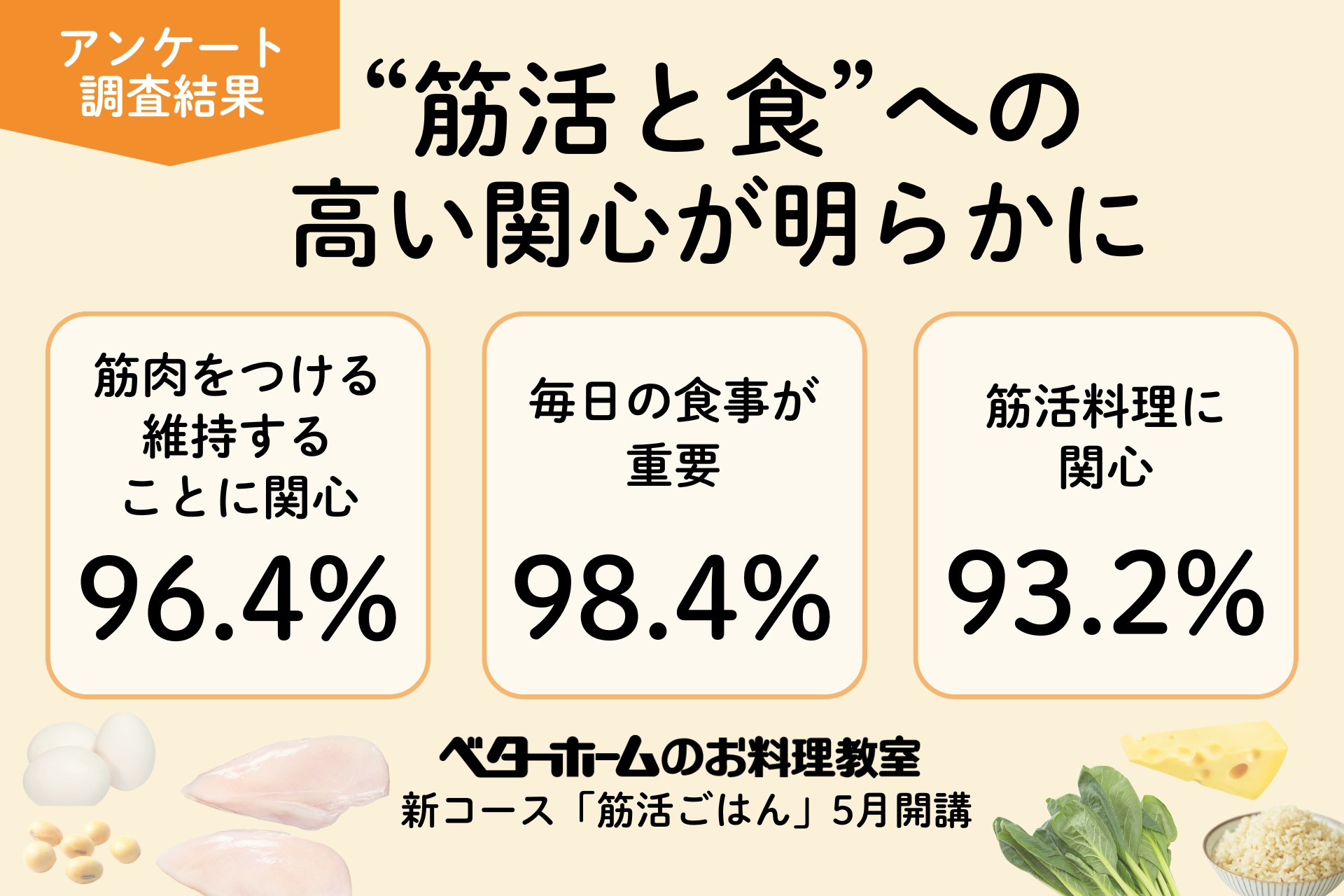 調査結果では、「筋肉をつける・維持すること」に関心がある人は96.4%、「筋肉をつける・維持するには毎日の食事が重要」と考える人は98.4%、「筋活を意識した料理を学ぶことに関心がある」人は93.2%にのぼり、筋肉の維持や健康寿命への関心の高さが明らかになりました。