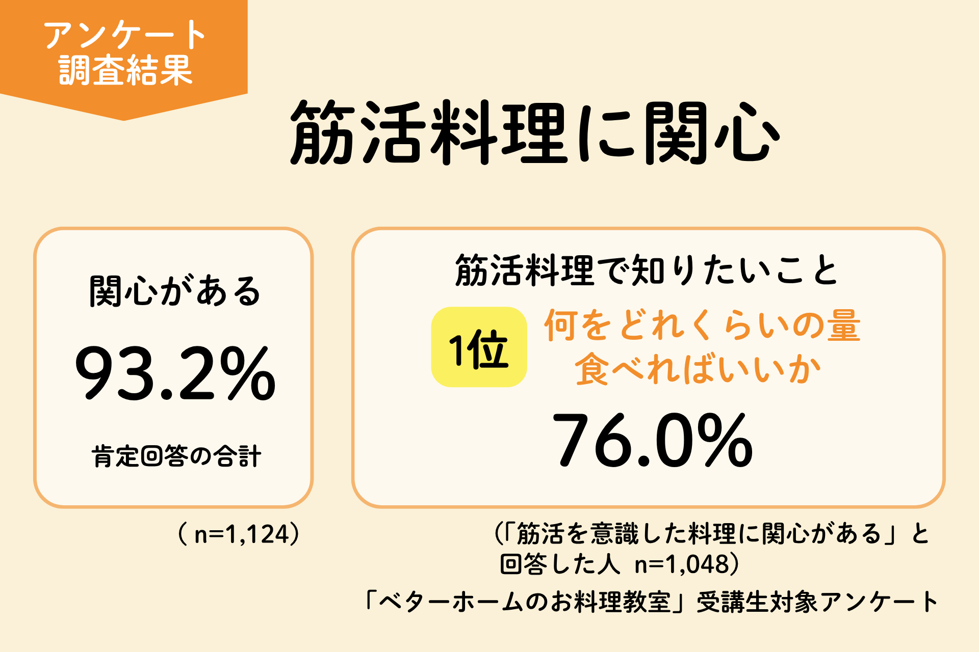 全国で料理教室を展開する一般財団法人ベターホーム協会(本部所在地:東京都渋谷区、理事長:大塚義幸、以下「ベターホーム」)は、「ベターホームのお料理教室」の受講生1,124人を対象に「筋活と食についての意識調査」を実施しました。
