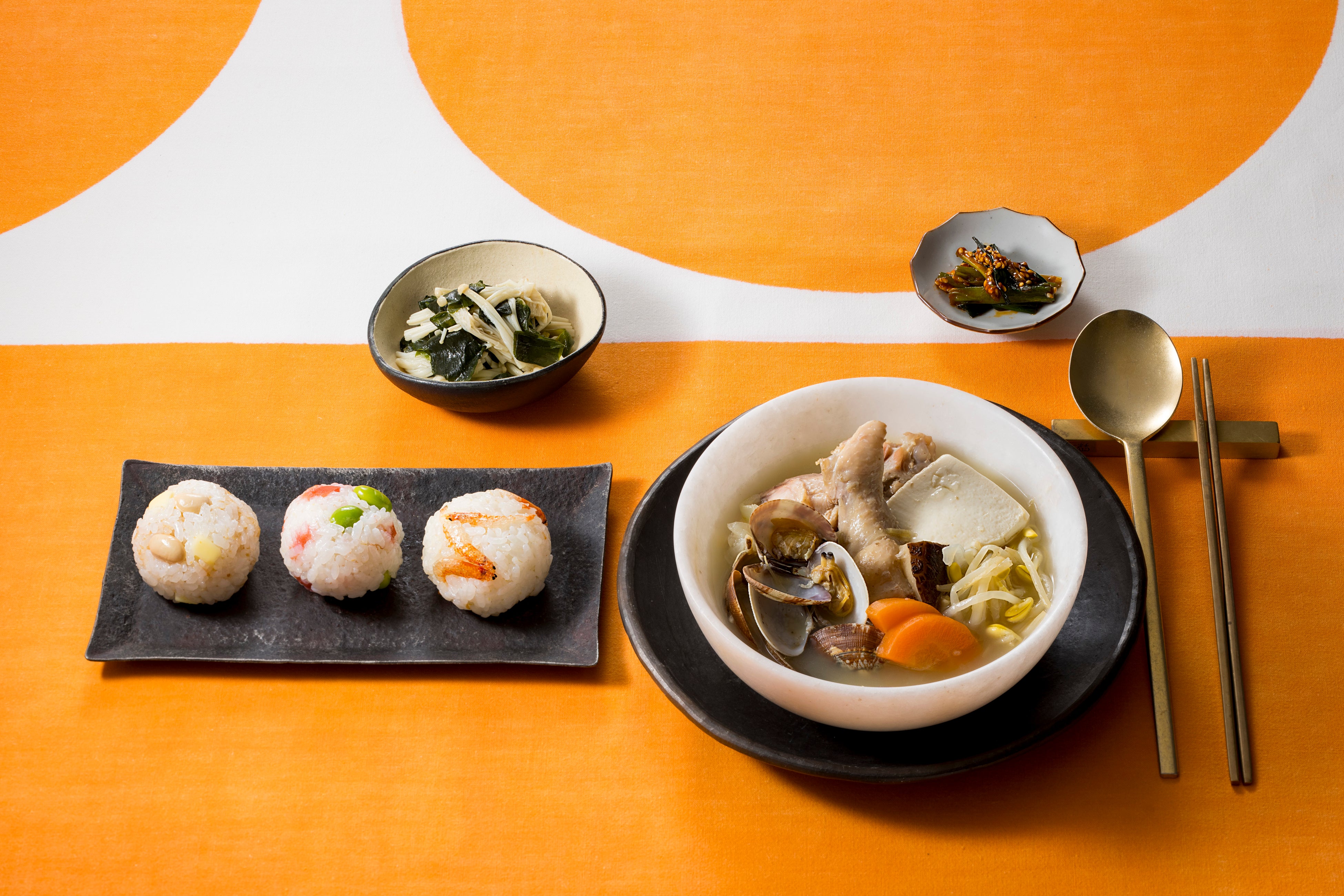 白いスンドゥブ/育筋ボールおにぎり3種/えのきとわかめのうま塩ナムル -