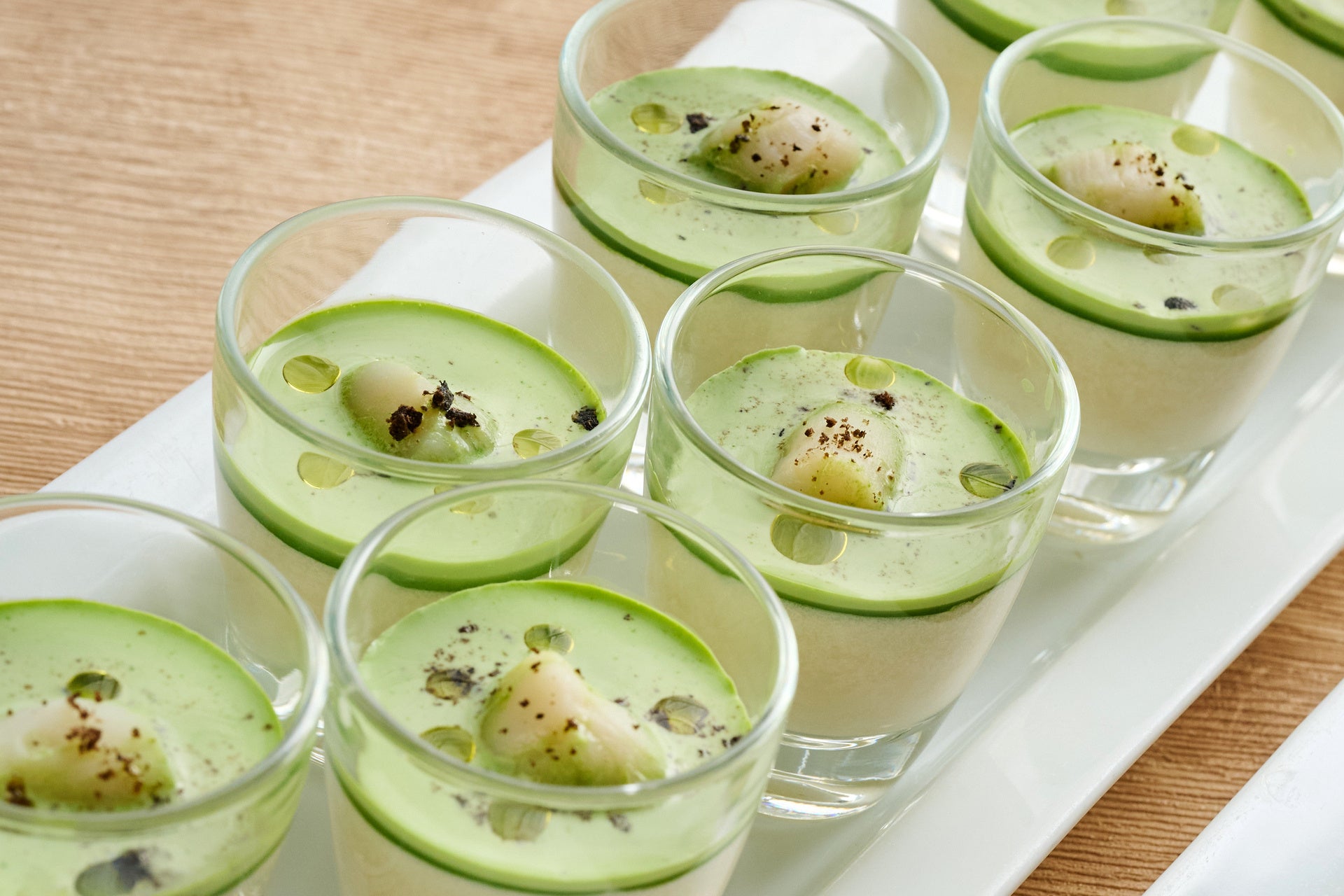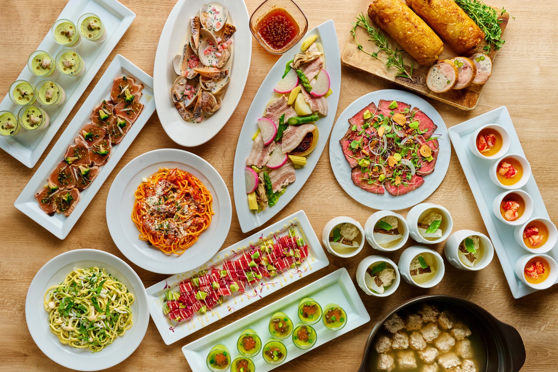 新ジャガイモのブランマンジェ クレソンのクレメ/マグロとアボカド/鰆のカルパッチョ バジル風味/蛤とタケノコのマリニエール風/鯛とつみれ レモングラス香る潮汁/豚バラ肉と春野菜のヴァプール など