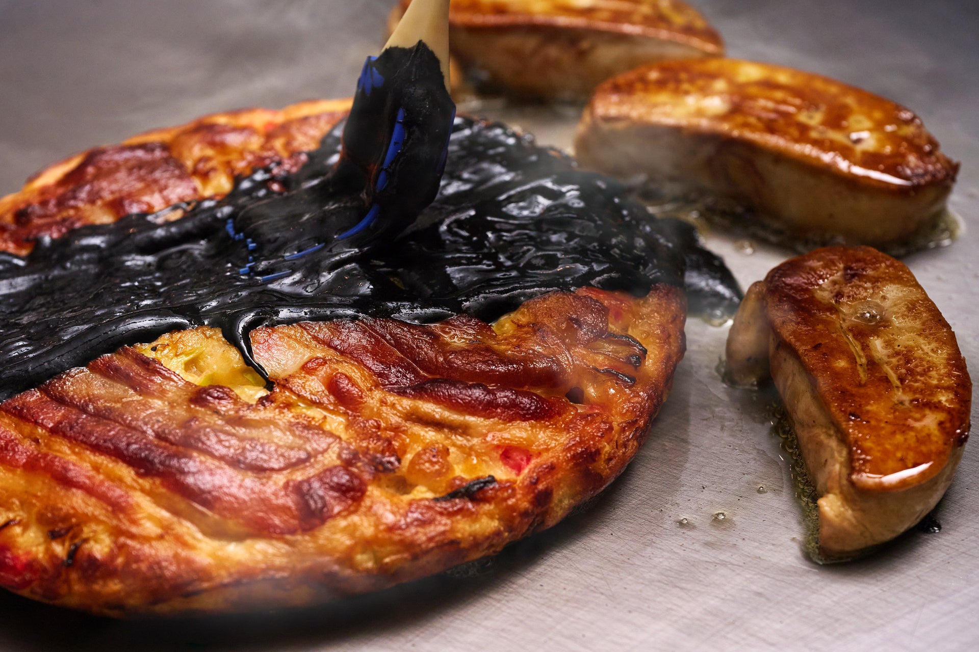 [ランチ限定] ブラックお好み焼き フォアグラ添え/串カツ3種 [ディナー限定] 牛ロース肉の鉄板焼
