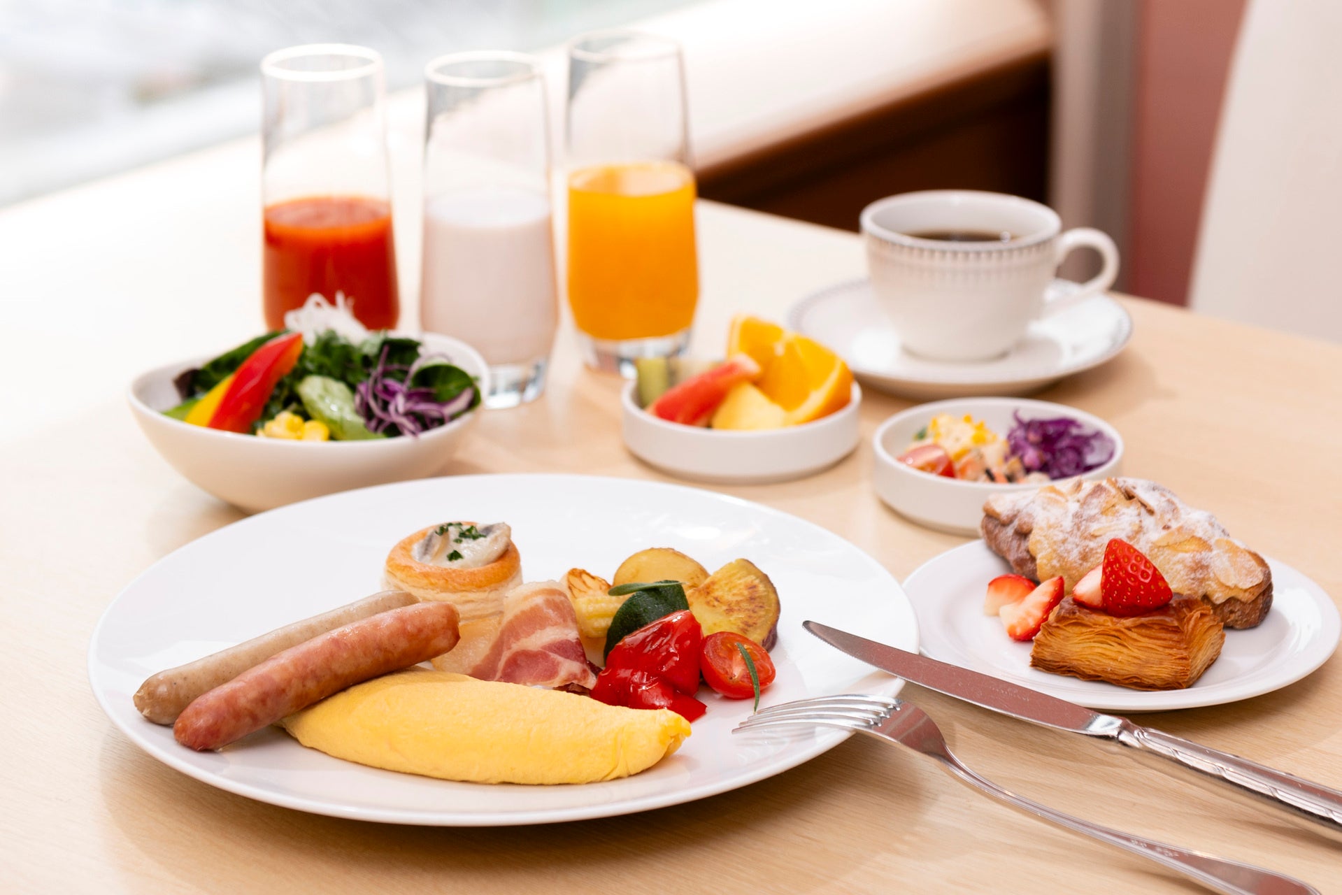 ご家族やご友人皆さまでのお集まりに最適な、バラエティ豊かなお料理をランチ・ディナーともに食べ放題でお楽しみいただけます。出来立てをご提供するライブキッチンメニューとして、ランチタイムには「ブラックお好み焼き フォアグラ添え」と「串カツ3種」を、ディナータイムには「牛ロース肉の鉄板焼」をご堪能ください。その他、「新ジャガイモのブランマンジェ クレソンのクレメ」や「鰆のカルパッチョ バジル風味」など季節の食材を使用したホテルシェフおすすめのお料理も種類豊富に取り揃えます。さらに、「オムライス」や「煮込みハンバーグ」といったキッズメニューに加え、デザートには焼き立てクレープを自由にアレンジできるコーナーやチョコレートファウンテンもあり、大人からお子様まで幅広くお楽しみいただけます。