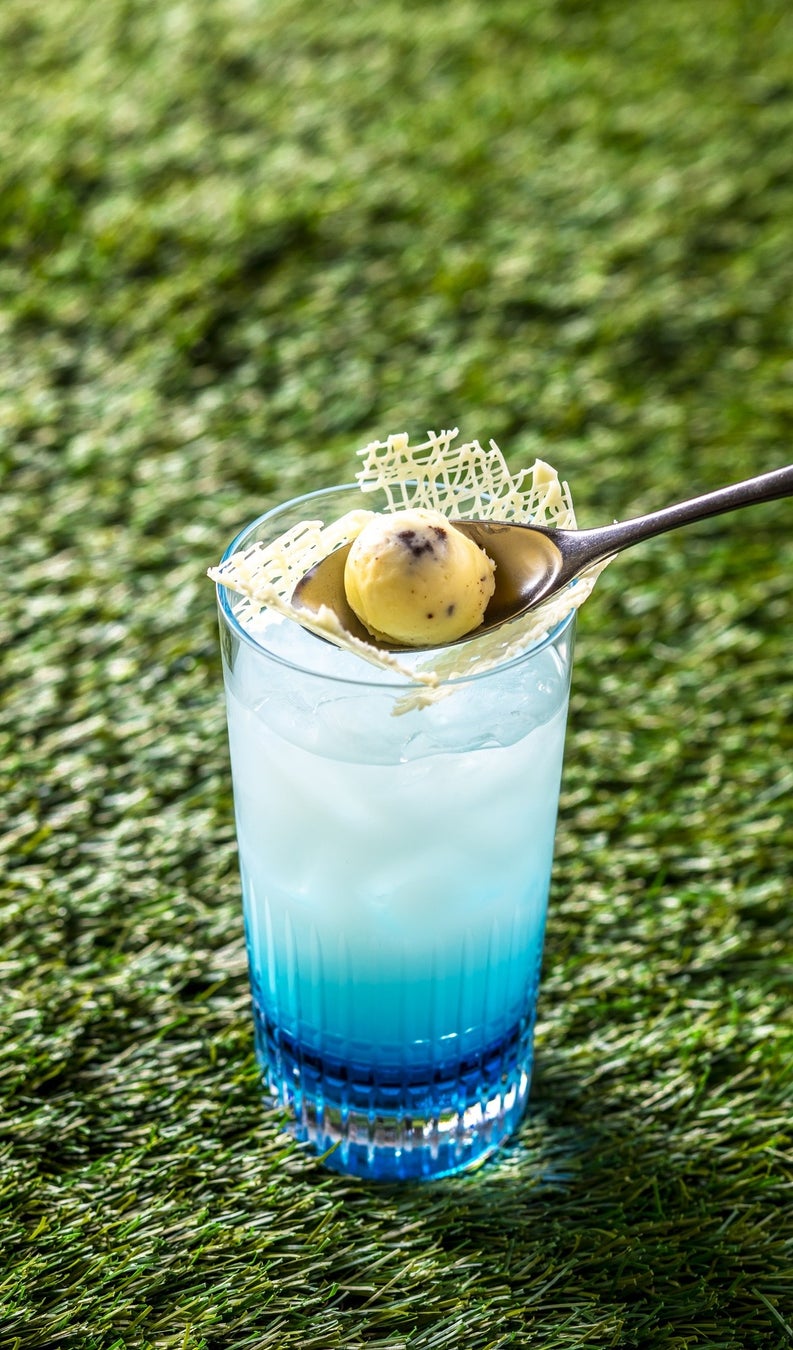 期間中、ご利用時間90分間の内、各回開始より45分後にハーフタイム演出として限定デザート『マンゴーわらび餅』を提供します。さらに、サッカーユニフォームを着用して来店された小学生を対象に、オリジナルドリンク『ゴラッソ』をプレゼントします。スーパーゴールを意味するゴラッソは、ボールに見立てたバニラアイスクリームをネットの上から落とし、グラスに注がれたドリンクにゴールさせて完成します。仕上げの瞬間に生まれる高揚感と驚きを愉しめます。