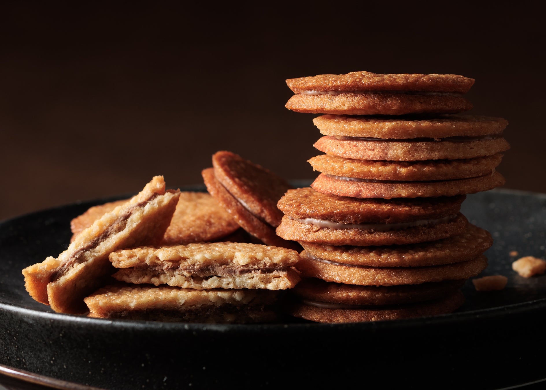 新作の「FLOOM(フルーム)塩キャラメルショコラサンド」が目指したのは、ほっと一息つくときの静かで贅沢な時間。コーヒーや紅茶と合わせれば、ゆったりとしたおやつ時間に。夜にはウイスキーやブランデーなどのお酒とともに、大人の味わいとしてもお楽しみいただけます。