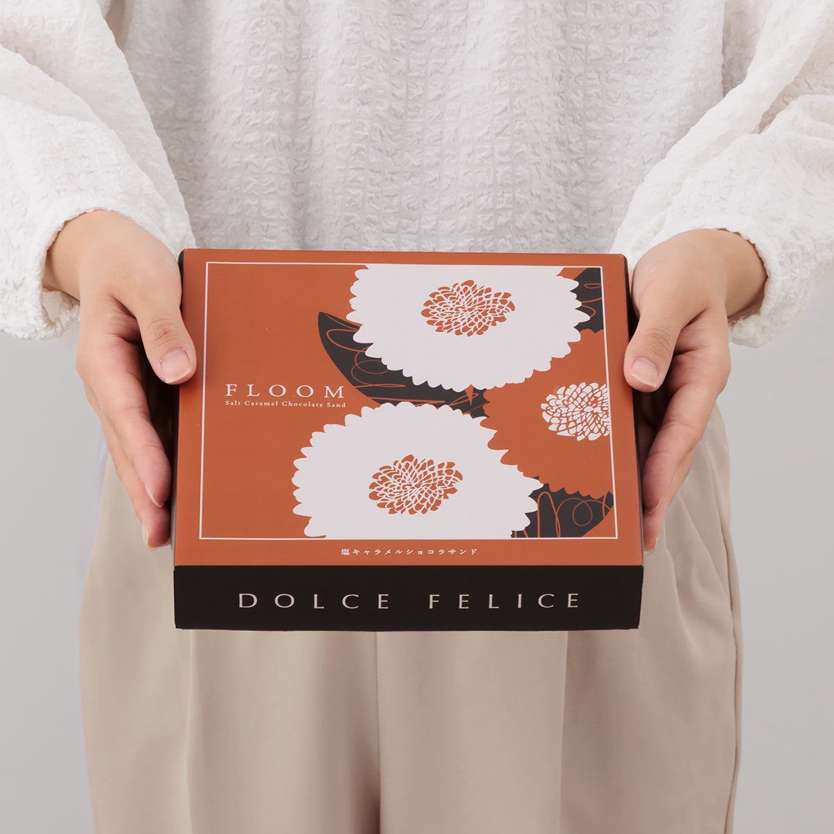 DOLCE FELICEのパッケージはすべて花をモチーフに自社デザイナーがひとつひとつデザインをしています。このFLOOMのパッケージはキャラメル・アーモンドをイメージするようなオレンジと、チョコレートのブラウンの2色を使い、「キンセンカ」をイメージしたデザインを採用。キンセンカの花言葉である「慈愛」「静かな想い」を象徴するように、大切な方へのギフトや、自分を慈しむリラックス時間にやさしく寄り添います。