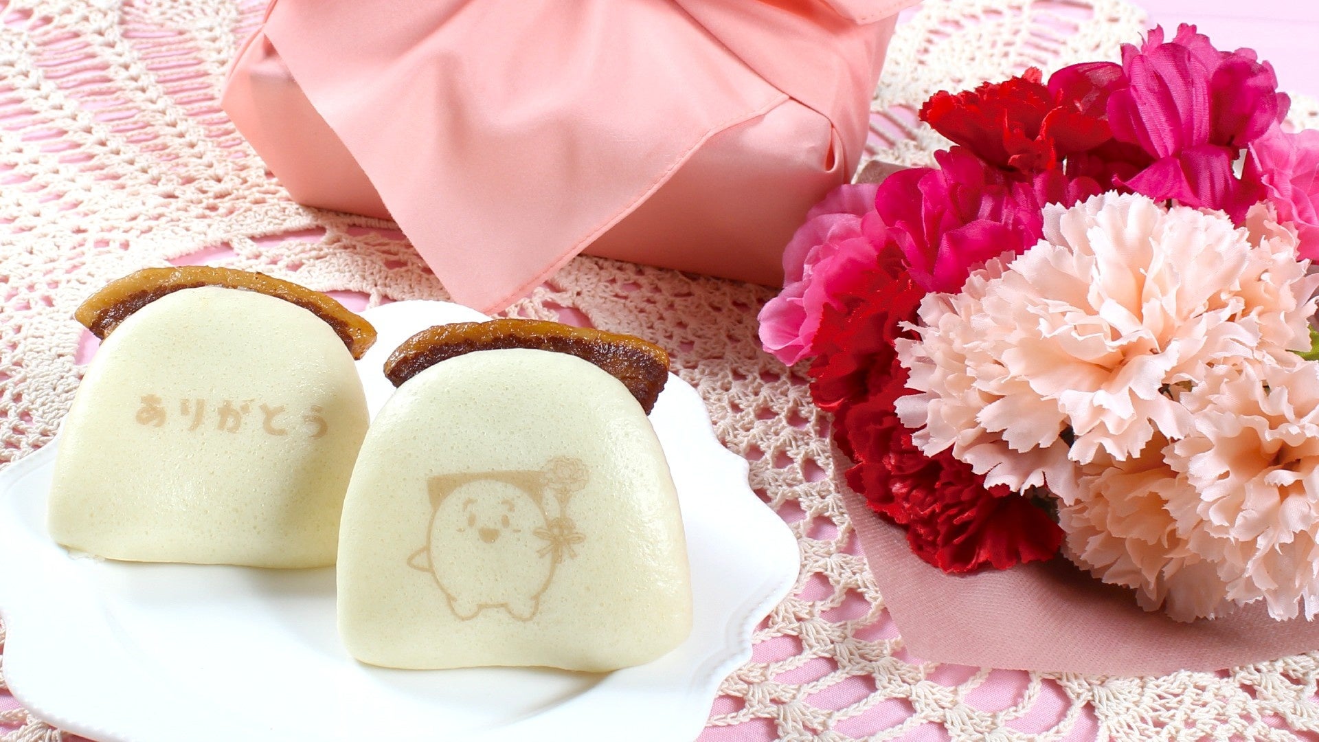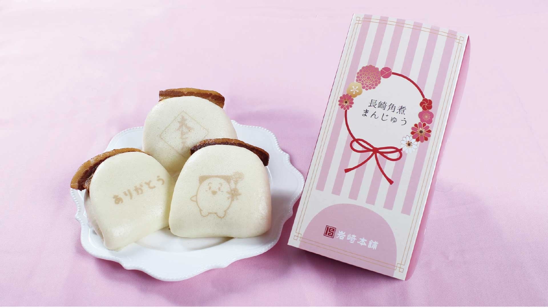 生地には「ありがとう」の文字と岩崎本舗オリジナルマスコットキャラクター「角煮まんじゅうちゃん」の2種類の印がプリントされています。さらに、角煮まんじゅうちゃんがお花を手にしており、言葉だけでは伝えられない思いも届けることができます。