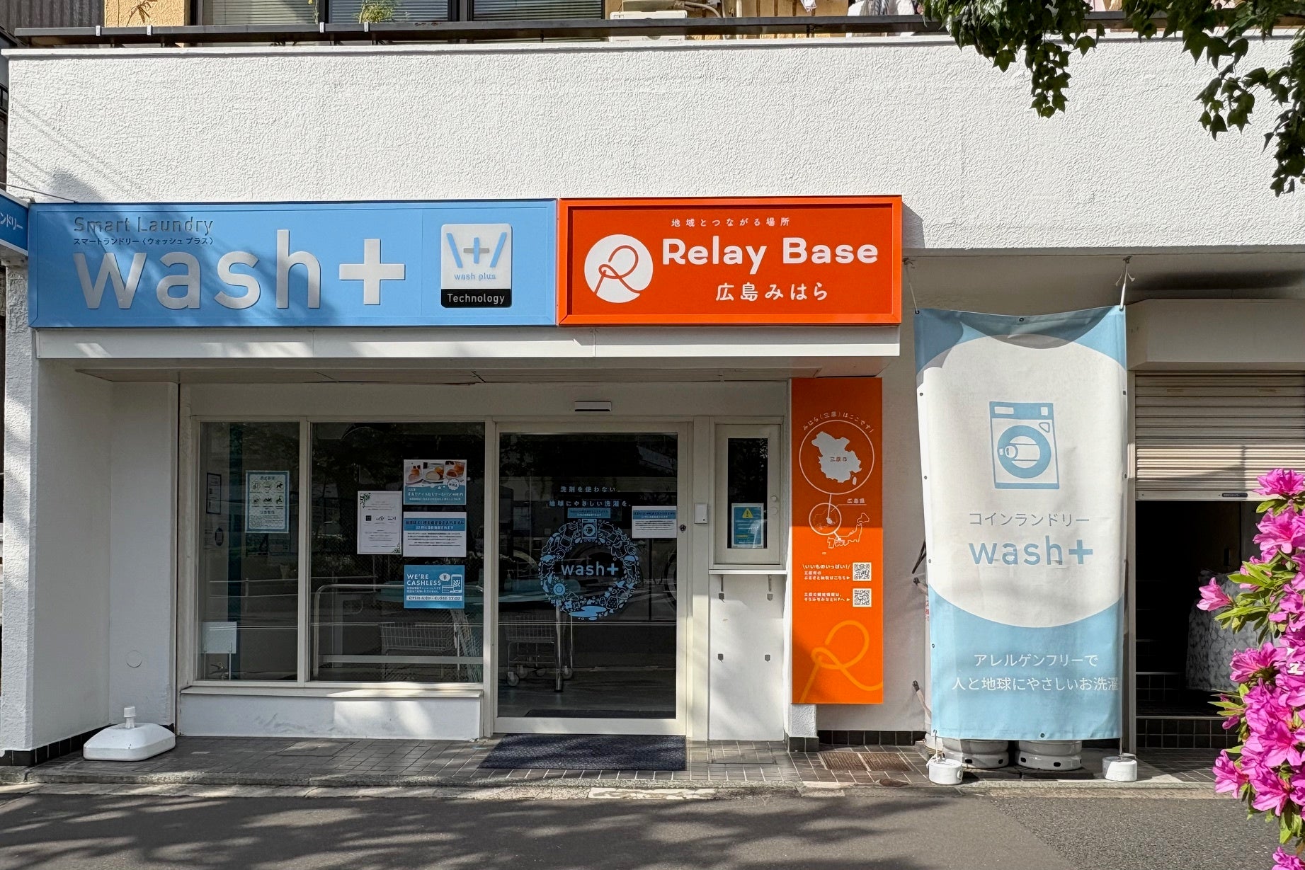 wash-plusでは、三原市、株式会社空・道・港、三原商工会議所のご協力をいただきながら、地方自治体とコインランドリーという、認知度・ブランディングの全く違うもののかけ合わせで、双方の認知度向上と売上増加に効果をもたらすことを目指し「リレーベース」を運営しています。