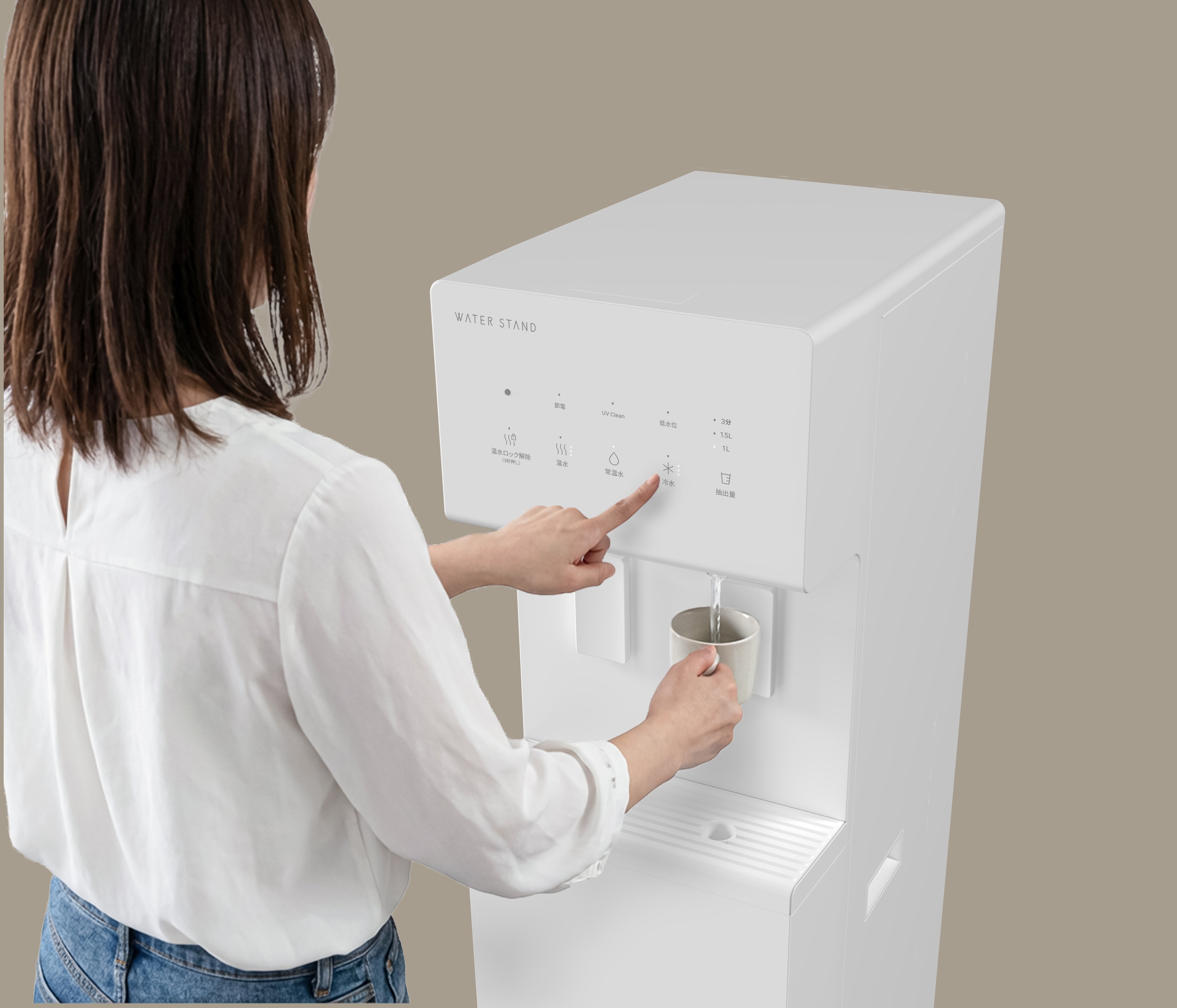 浄水型ウォーターサーバー「ウォータースタンド」は、ボトル不要でいつでもおいしい飲料水が使える利便性の高さと、運搬や使い捨て容器を必要としないエコな給水システムが支持され、子育て世帯を中心とした個人宅や、SDGs達成に取組む法人、大学などに支持されています。