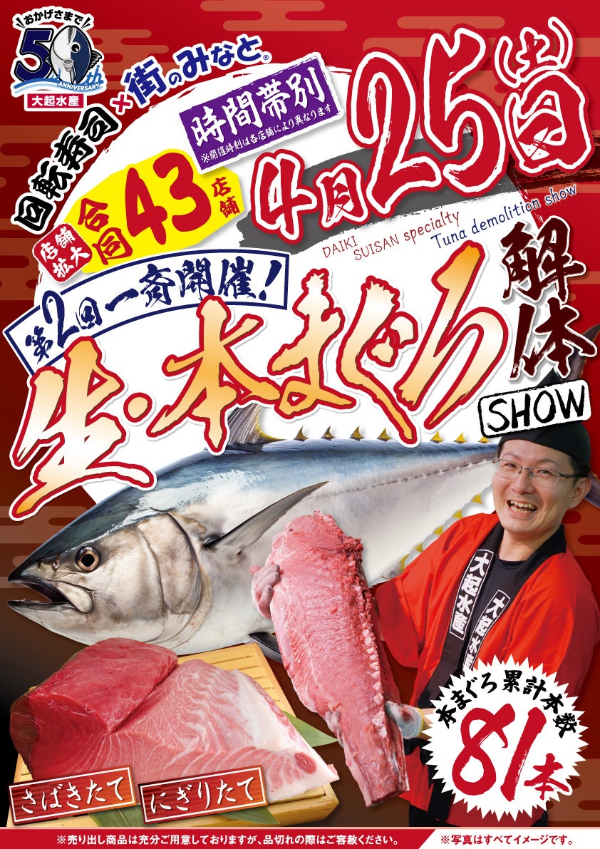 大起水産株式会社(本社:大阪府堺市 代表取締役社長:佐伯 慎哉)は、弊社の回転寿司店(27店舗)と堺市にあるまぐろパーク堺本店、街のみなと(13店舗)にグループ店(2店舗)も新たに加えて「生・本まぐろ解体ショー」を一斉同日開催いたします。