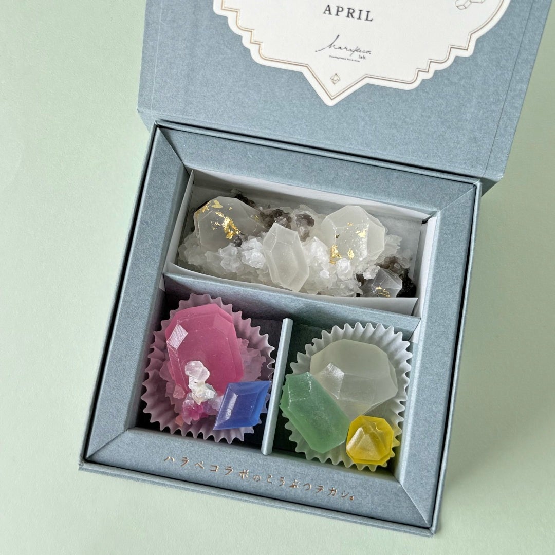思わず飾っておきたくなる!シャリっと食感が楽しい琥珀糖【4月のこうぶつヲカシ-誕生石ダイヤモンド-】も好評販売中