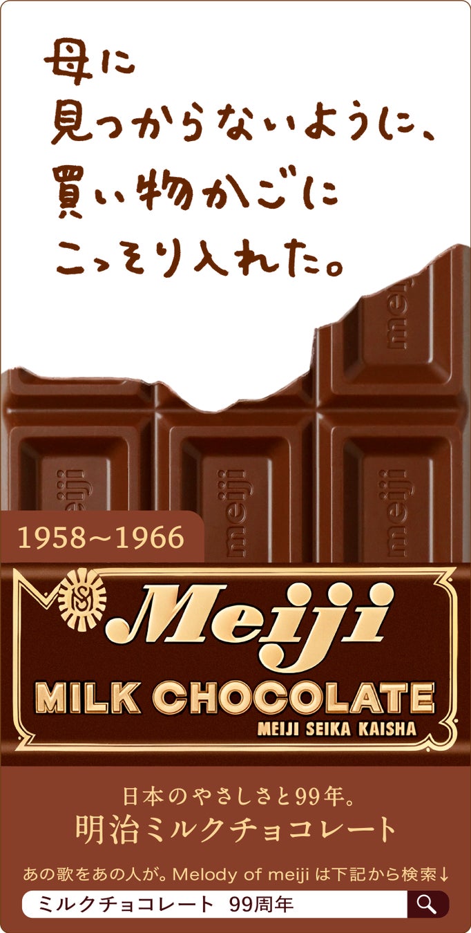 創業当初に新聞の小枠広告を掲出していたことにちなみ、99周年を迎えた2025年9月から、毎月13日の読売新聞朝刊(全国)にて、「時をかけるチョコレート。」をテーマにした小枠広告を掲出。あらゆる世代の「明治ミルクチョコレート」とともに過ごした記憶を、昔のパッケージとともに発信してきました。4月13日(月)には、1958年から1966年まで使われたパッケージがデザイン。誰もが幼い頃に経験した、母親とお買い物をしたときの情景が思い出されるエピソードとともにお届けします。