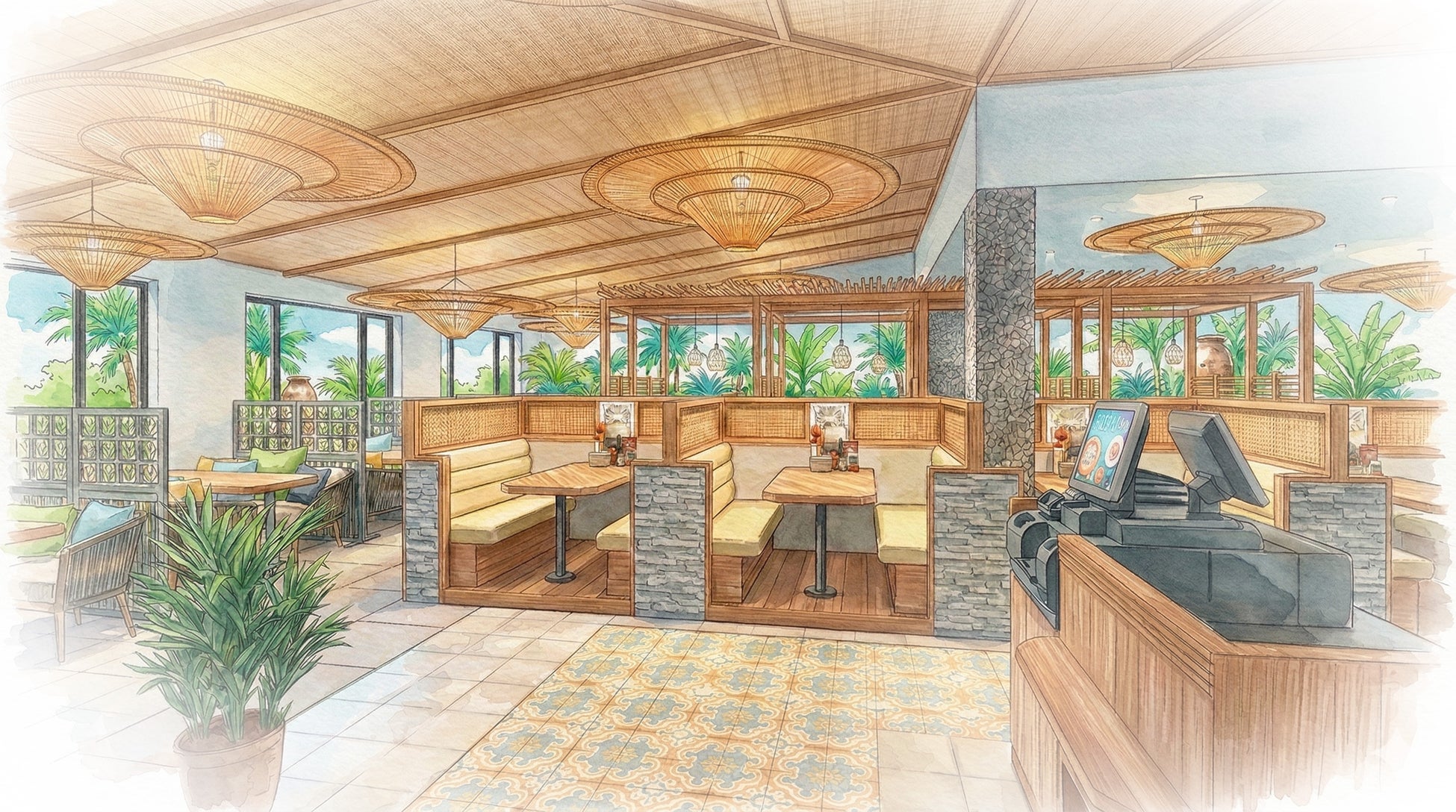 南国のリゾートを思わせる爽やかなインテリア、そして日常を忘れさせてくれるゆったりとした空間設計。岡山浜野店はご家族でのお食事、記念日、気の合う仲間との語らいなど、その日の気分やシーンに合わせて34卓、130席の空間をご用意しております。