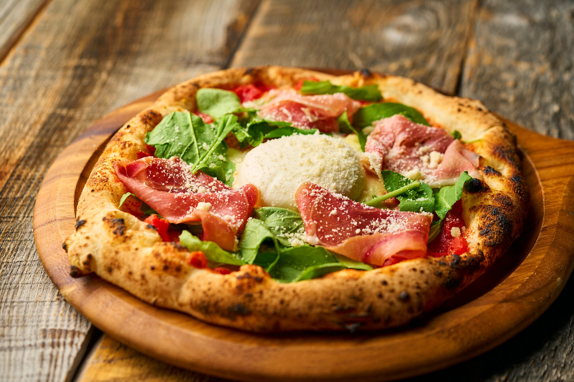 注文が入ってから生地を伸ばし、400℃の高温窯で一気に焼き上げた香ばしい生地。とろける華やかなブッラータチーズと生ハムの旨味。外はパリッ、中はフワの食感を味わえる窯焼きピッツァです。