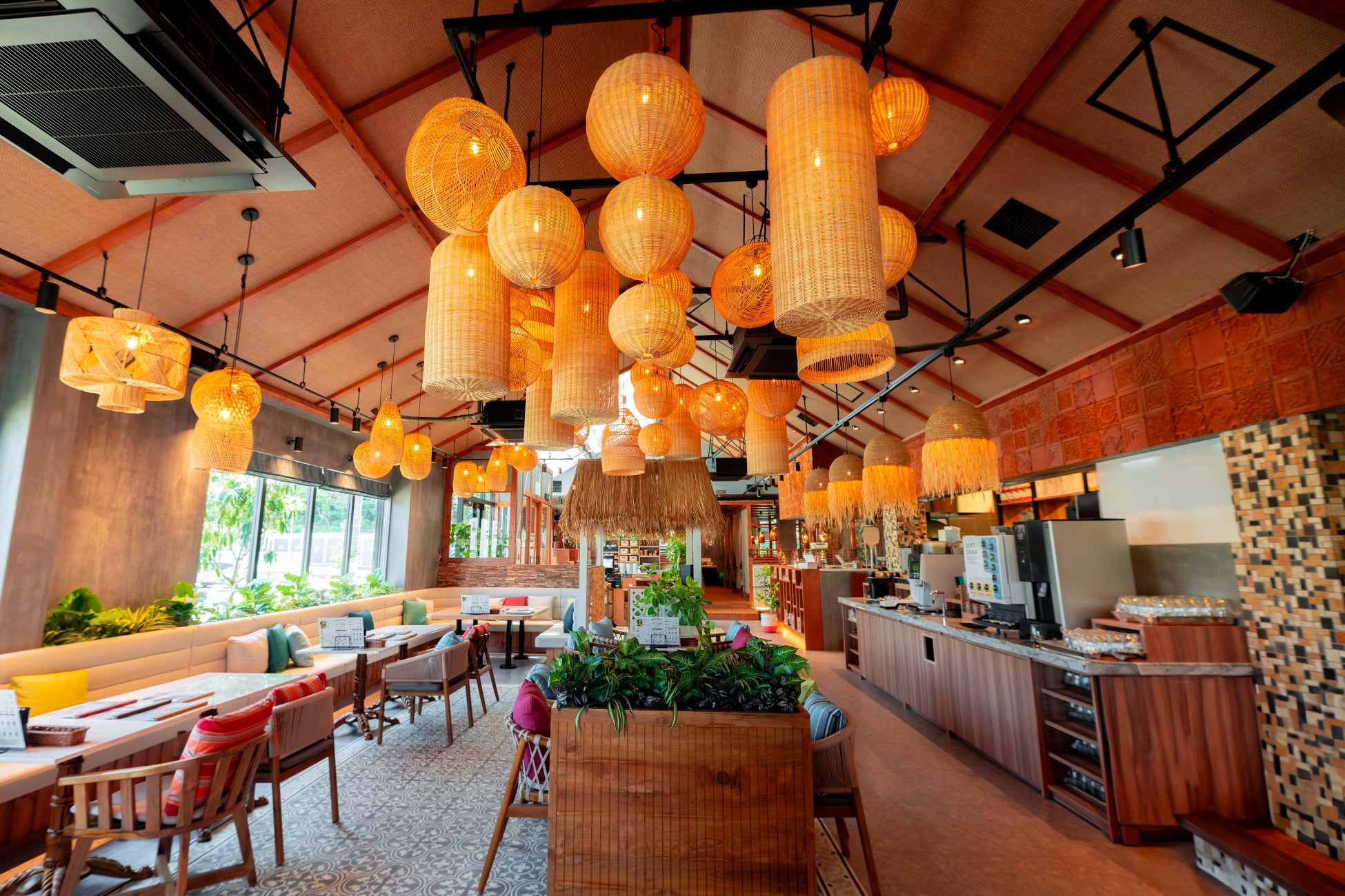 バリ島で直接選定した、現地の職人による手作りで造作した大きなラタンの照明が、木の質感を活かした迫力のある空間を演出します。
